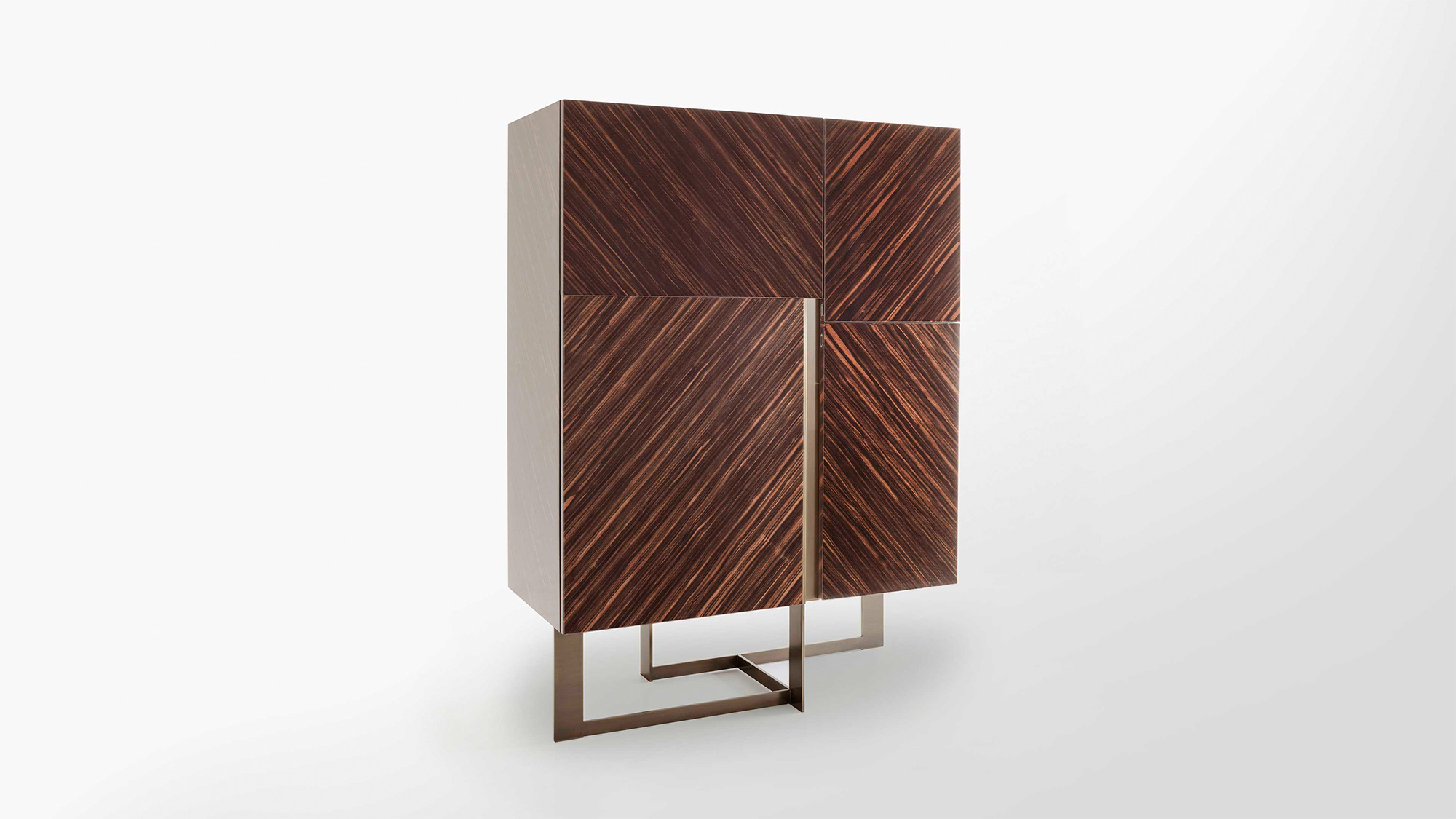 Blade is a bar cabinet with bold geometric lines, defined by its imposing metal base and statement doors that become a focal point in any space.