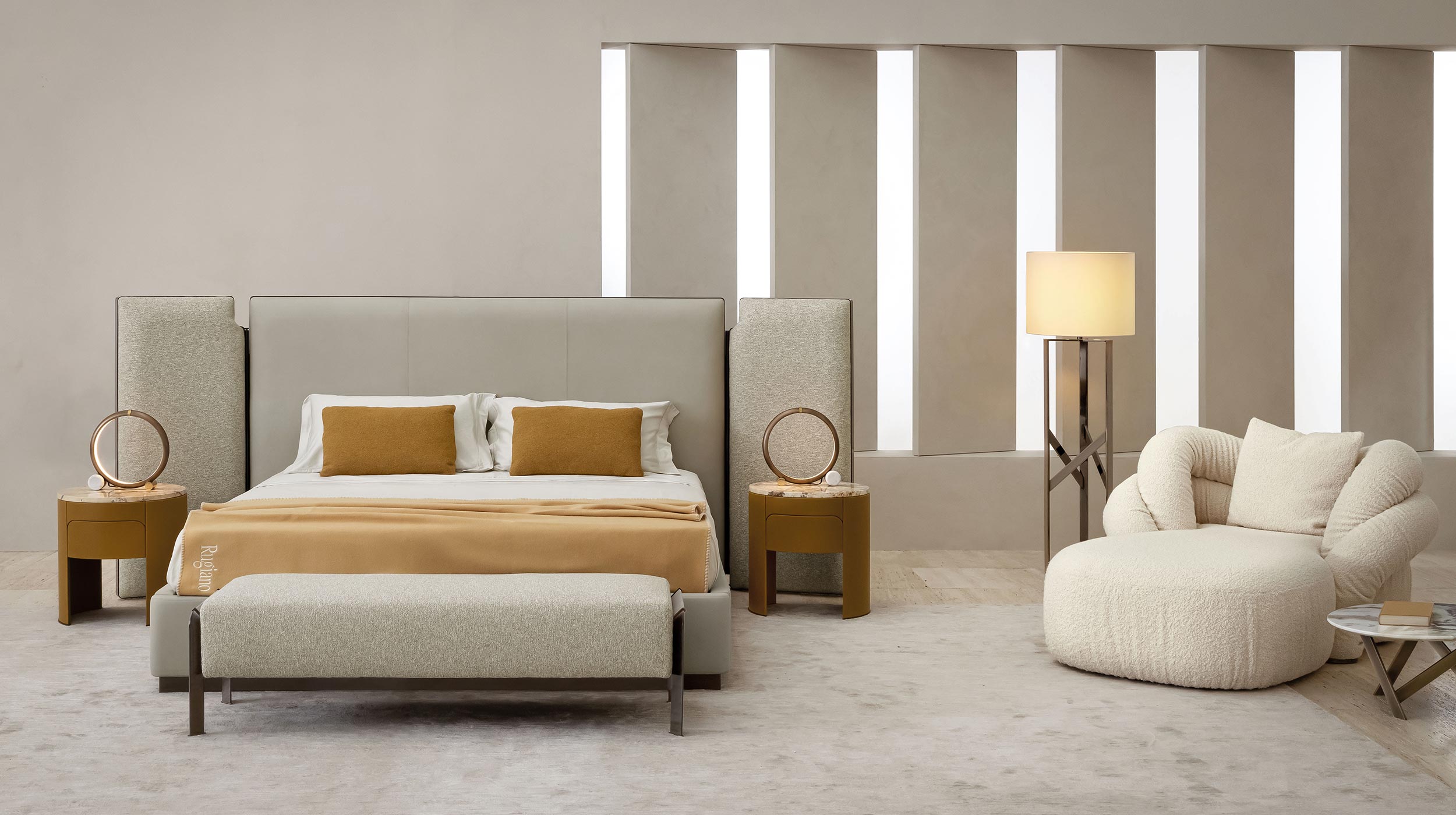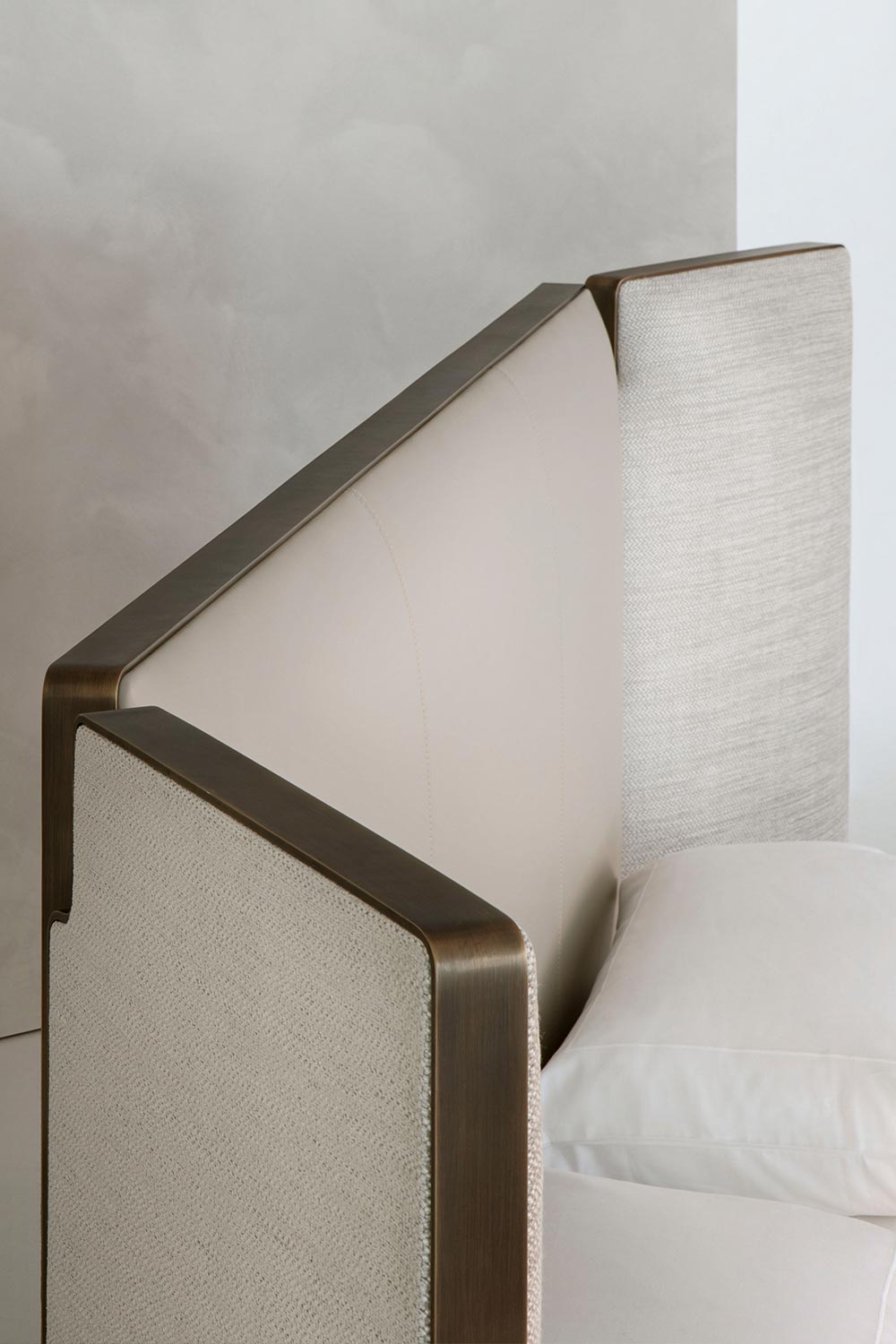A refined bronze insert embellishes the entire structure, subtly emphasizing the geometry and reflecting light with an elegant, never excessive touch. The feet, also in bronze, complete the design with coherence and material continuity. Like every Rugiano creation, Falcon is fully customizable: coverings, finishes, and details can be tailored to suit different palettes and design languages, while always retaining a strong, sophisticated, and recognizable identity.