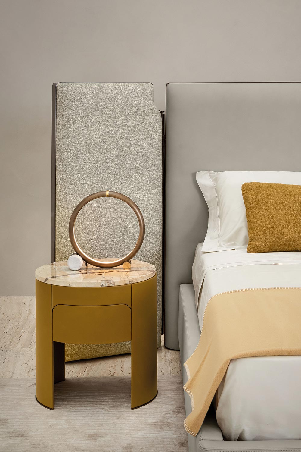 With its bold and sculptural profile, the Falcon Bed transforms the bedroom into a space of formal balance and architectural beauty. The starring element is the large upholstered headboard, enriched by two integrated side wings that extend outward like a protective and embracing gesture, creating a striking visual frame.