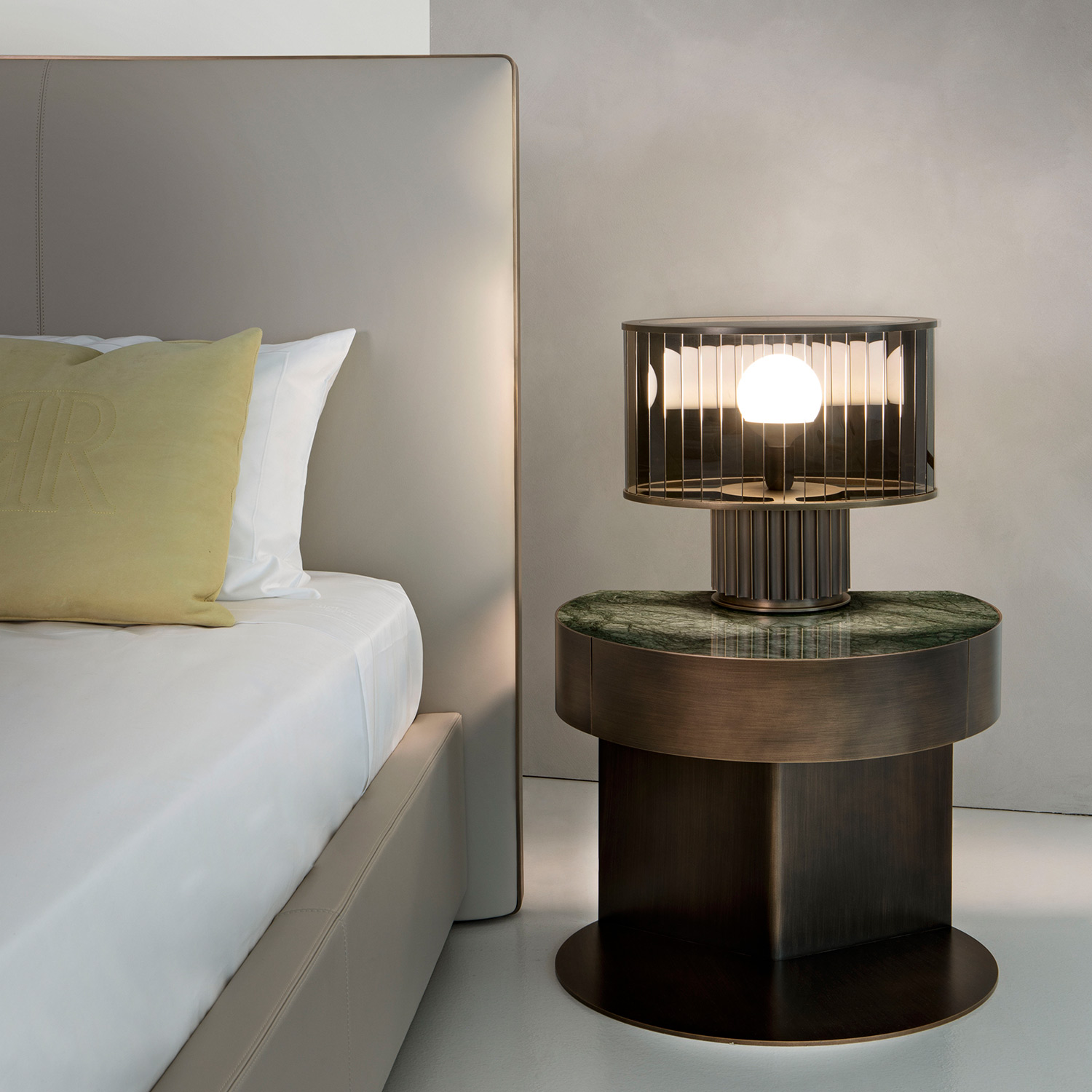 The large upholstered headboard thus becomes the absolute protagonist, defined by balanced proportions and an elegant presence that transforms the wall into a backdrop of discreet and refined luxury. A bronze insert embellishes the structure, while the matching bronze feet complete the design with continuity and sophistication.