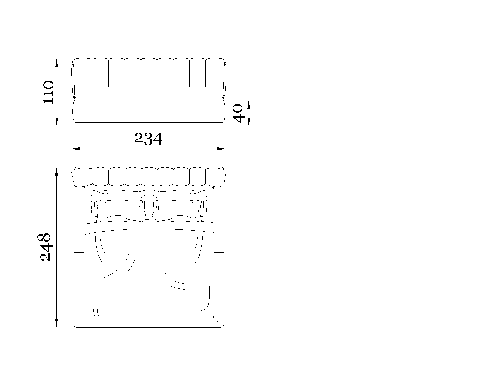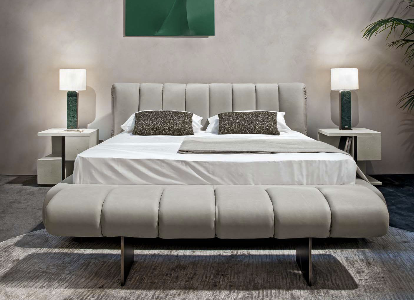 The headboard takes center stage — upholstered, enveloping, and visually modeled — capturing the light and animating shadows in a continuous interplay. The bedframe, integrated with balance, grounds the composition with a solid yet elegant presence, contributing to the overall aesthetic language.