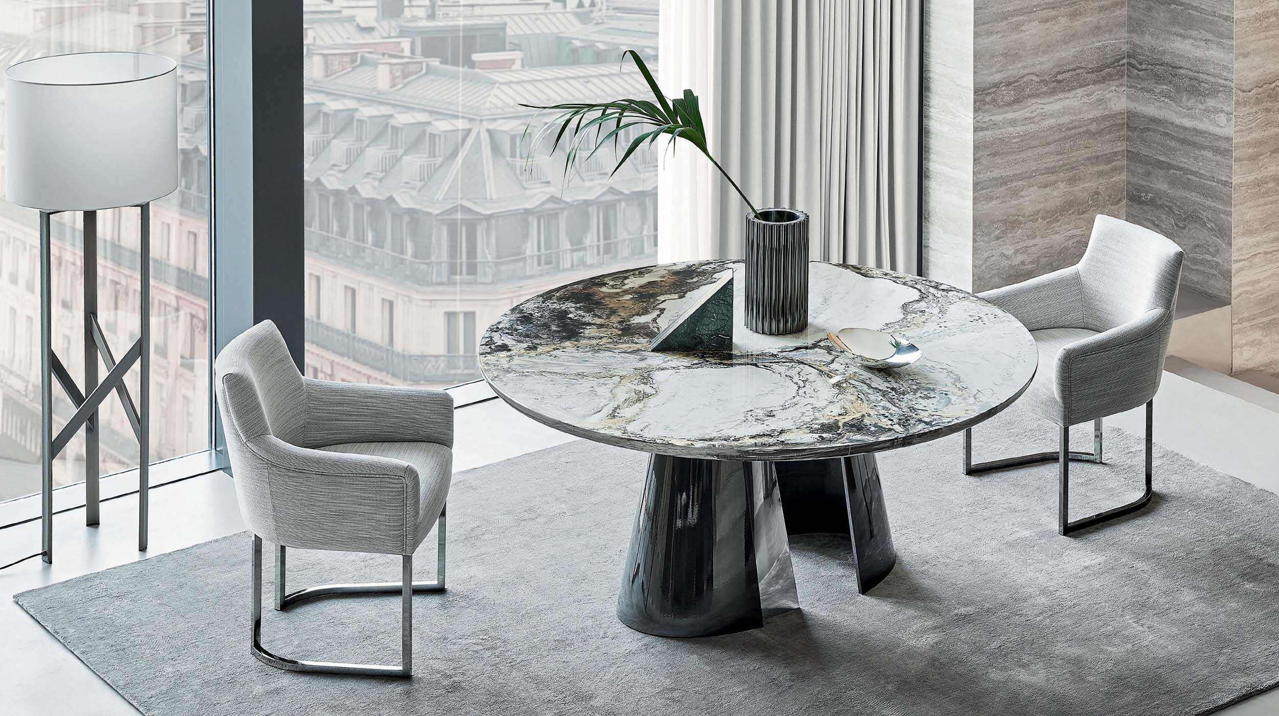 A technical and minimalist surface. The fine brushing of the steel creates a professional matte texture, both resistant and luminous, perfect for enhancing the geometric design of the bases.