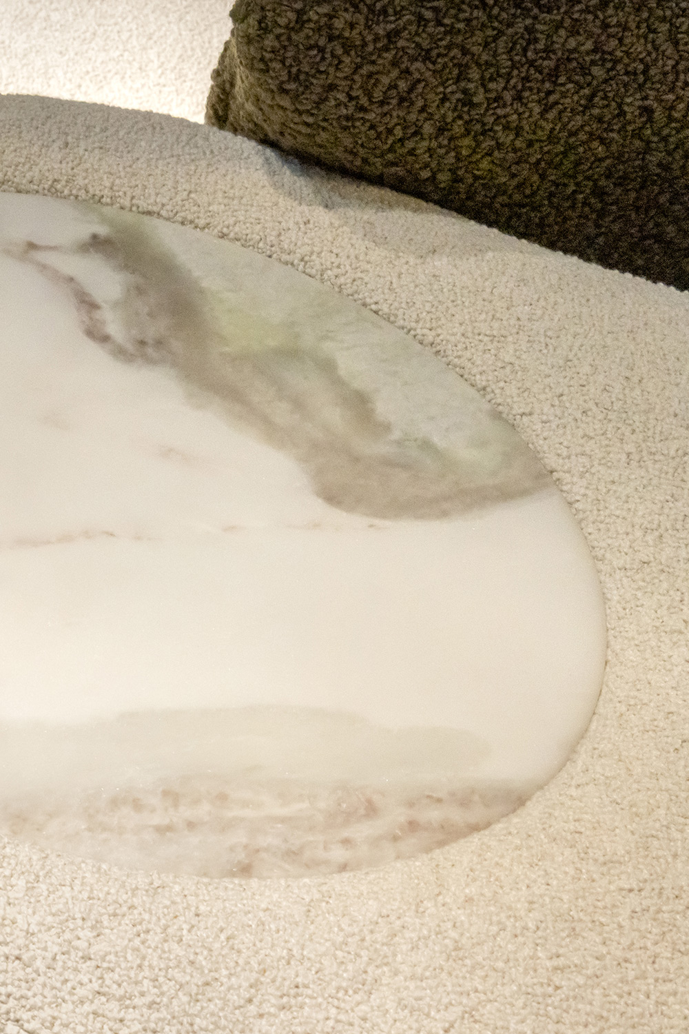 The fully upholstered structure—available in leather or fabric—gently embraces the body, while the backrest features a refined natural marble insert: a sculptural detail that elevates the entire piece with its unique material presence, making each chaise longue one of a kind.