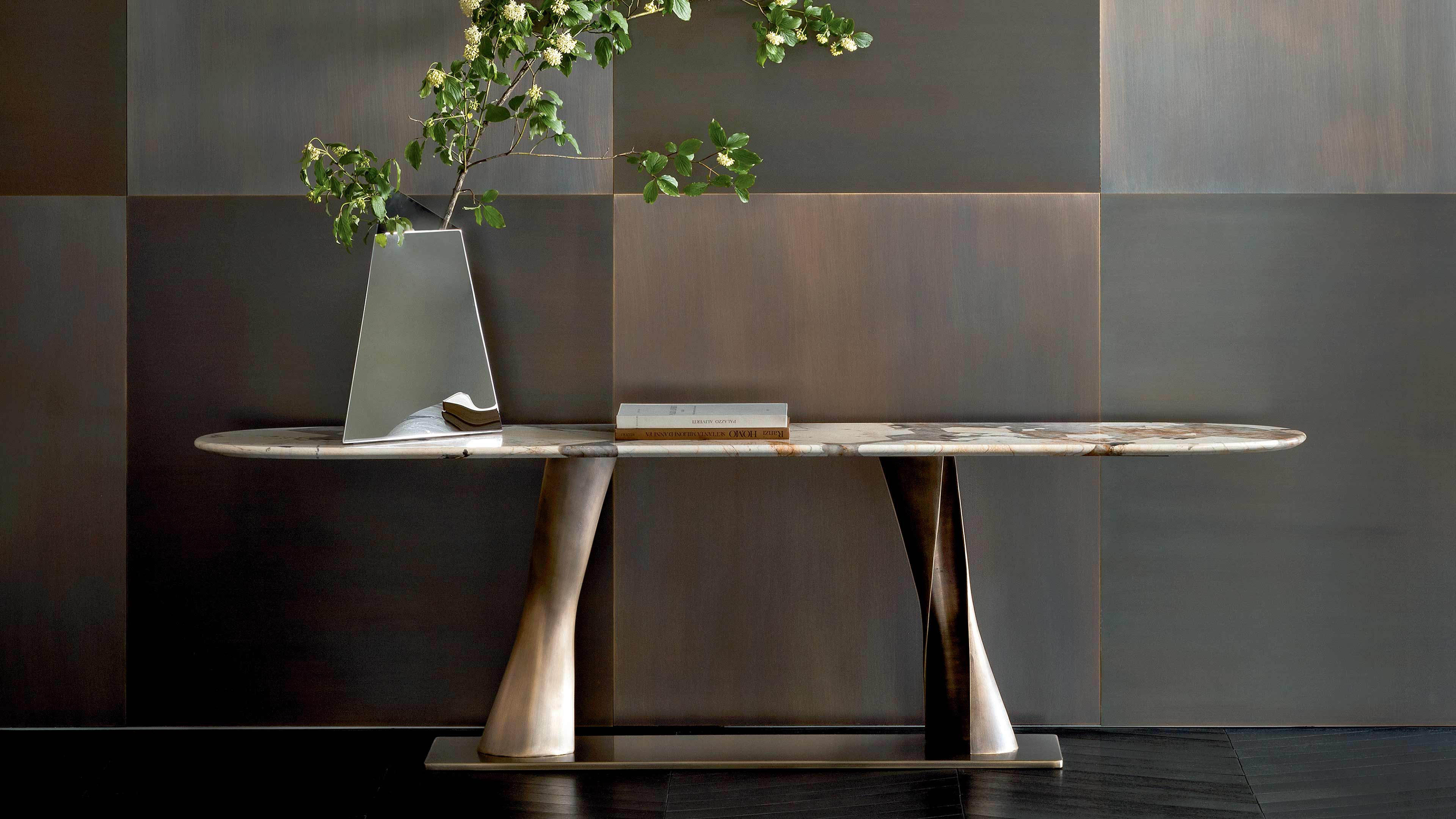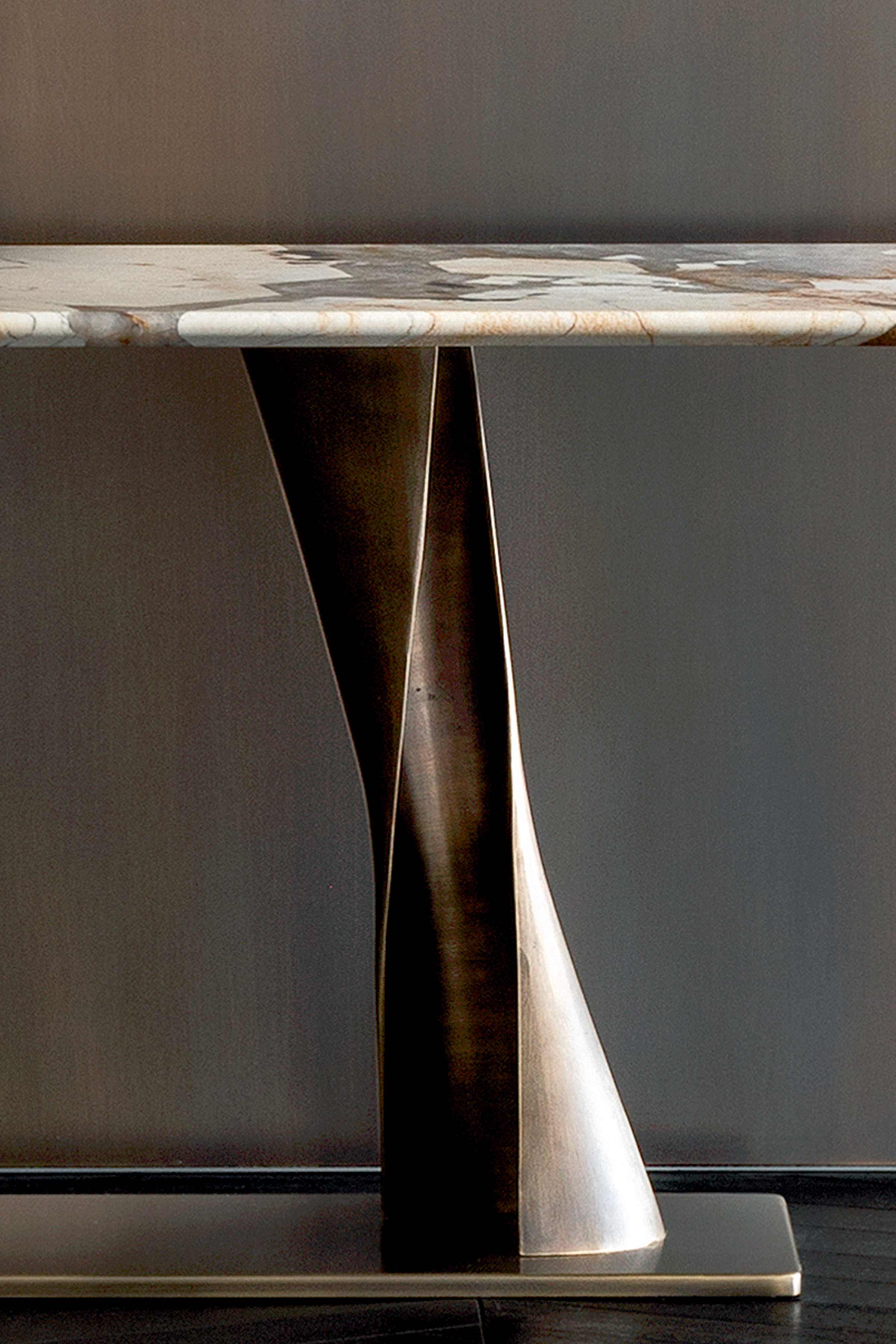 Console composed by two sculpturesque bronze fusion elements as a base and an oblong oval top, available in wood and marble, hand-painted or upholstered in leather.