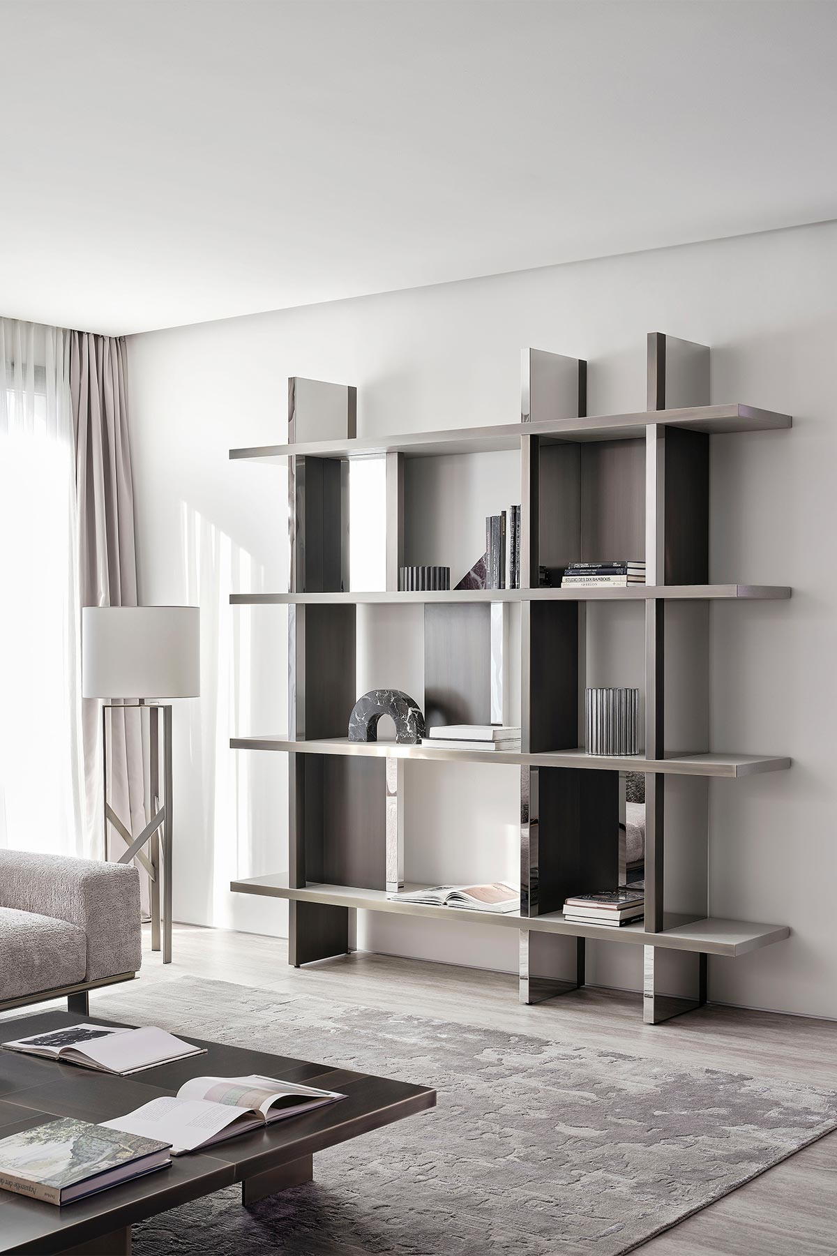 Bookshelves available with bronze and chrome or upholstered structure. Shelves upholstered in leather. Box-compartments with stitched and upholstered doors also available.