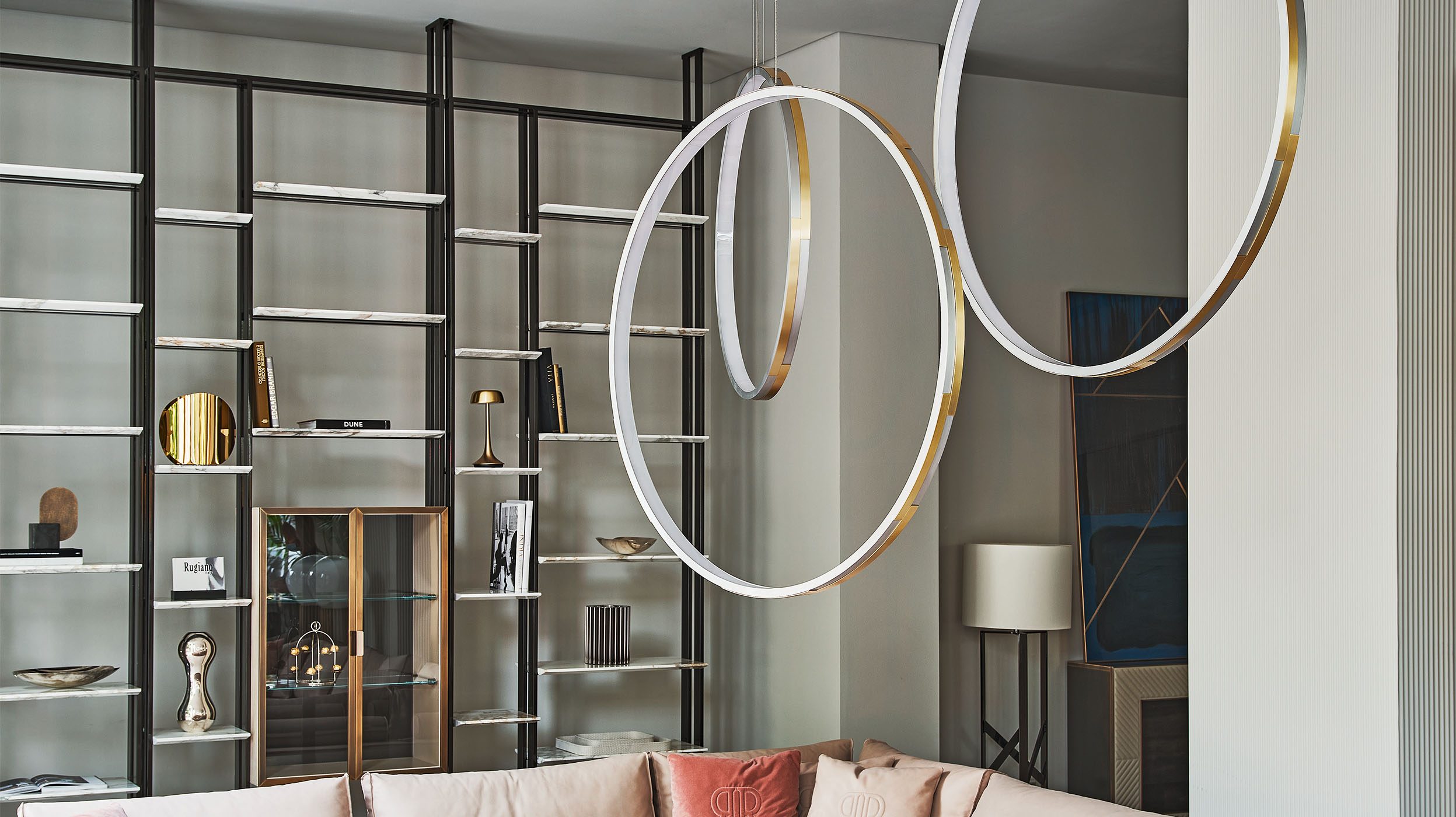 Bookshelves with a painted bronze or dark chrome finish structure, with a selection of shelves either in marble or upholstered in leather. Box-compartments with stitched and upholstered doors (on one or either side) also available. Optional glass cabinet c