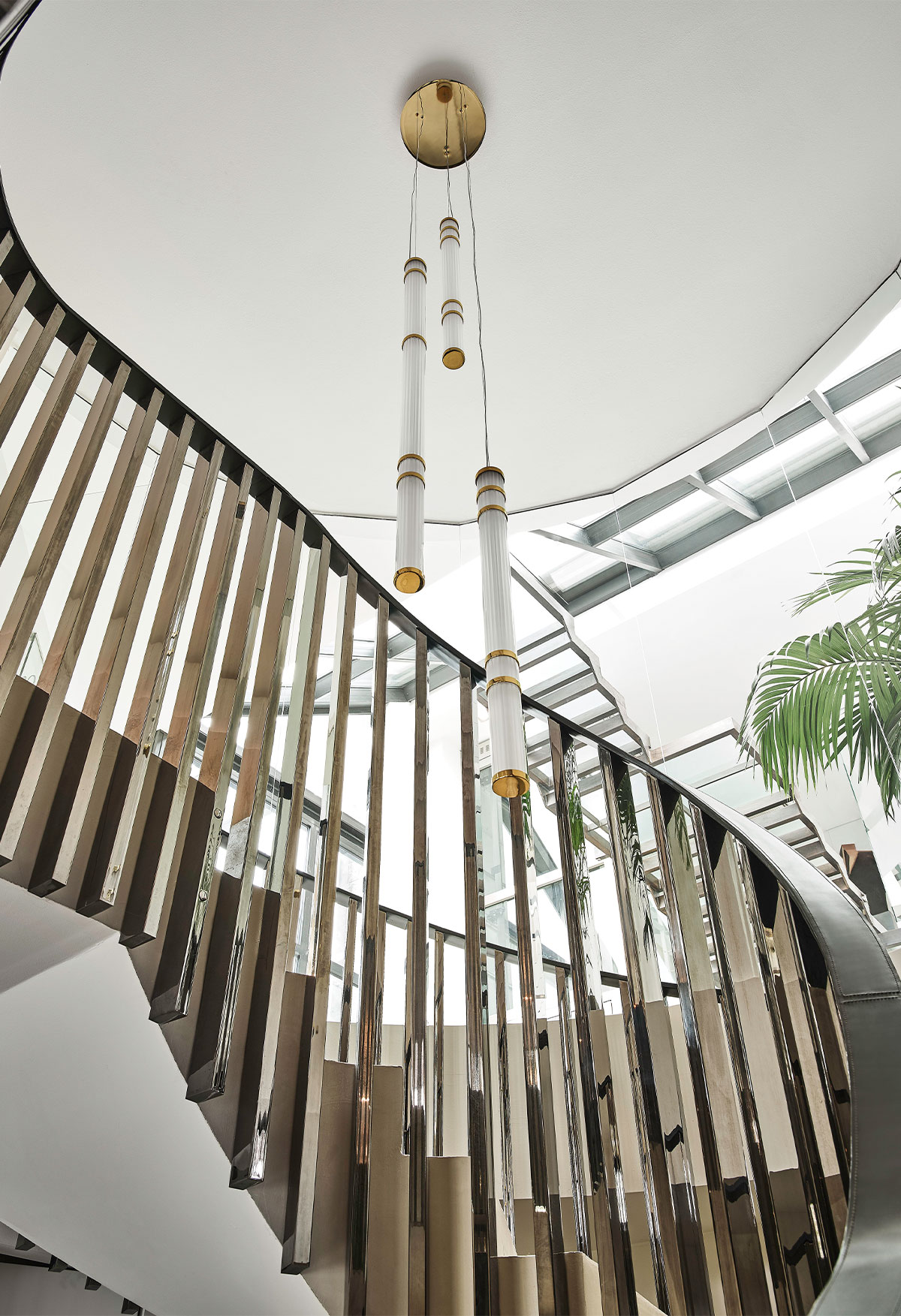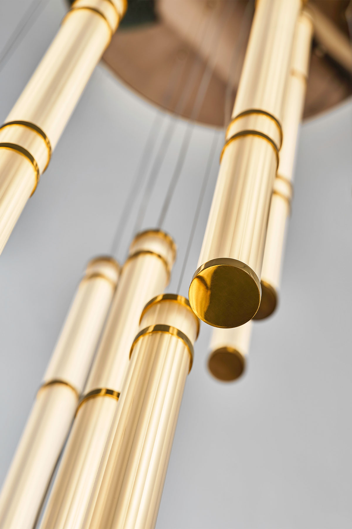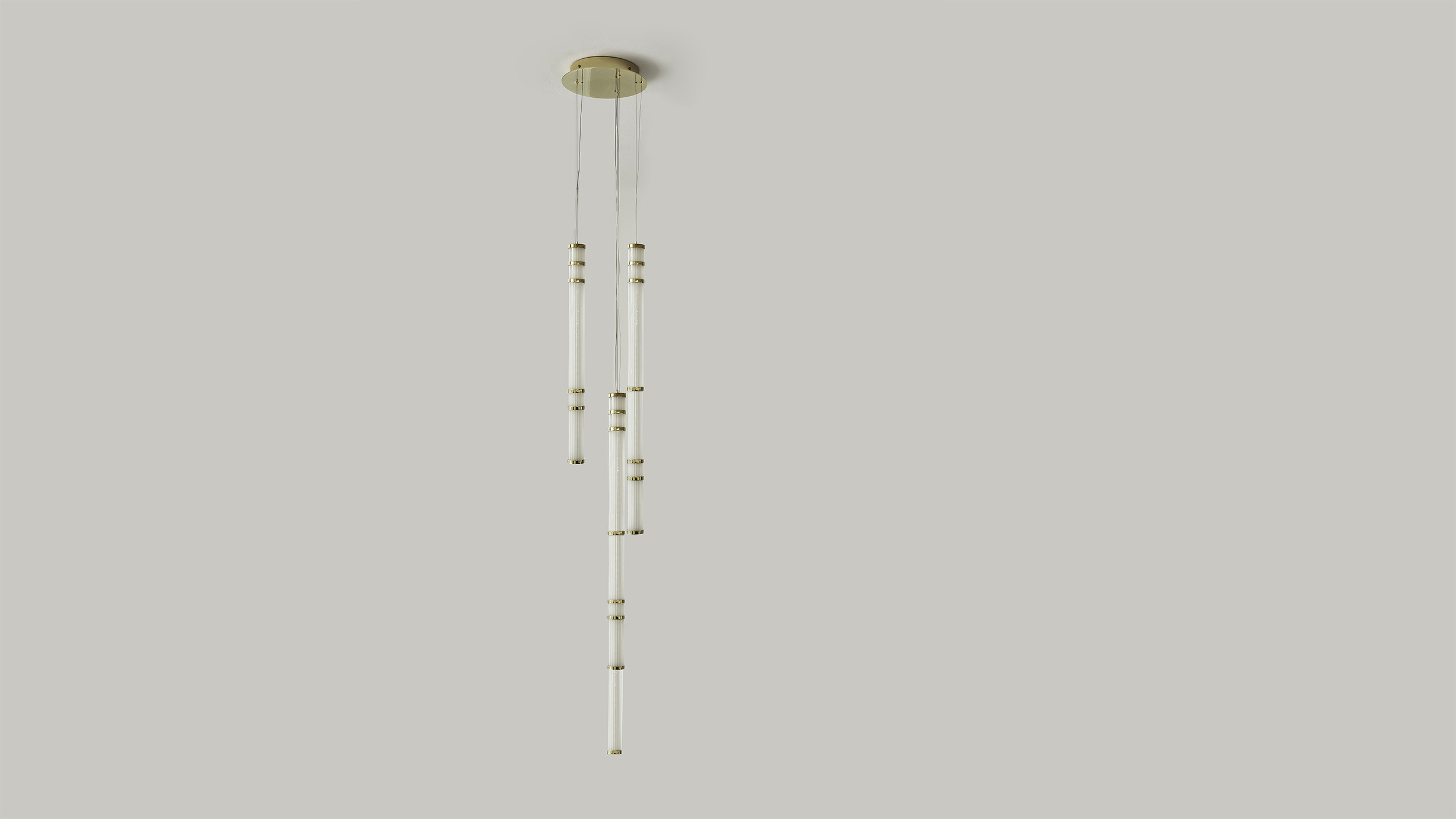Collection of satin glass lamps with polished brass, single or modular suspensions. Linear shapes harmoniously combined.