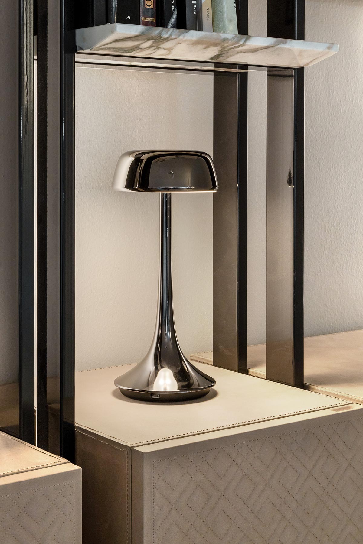 Collection of lamps of different sizes. Feature of the smallest is that it is portable, rechargeable and adjustable by touch. The other classic lamps, the floor lamp enriched by a marble table.