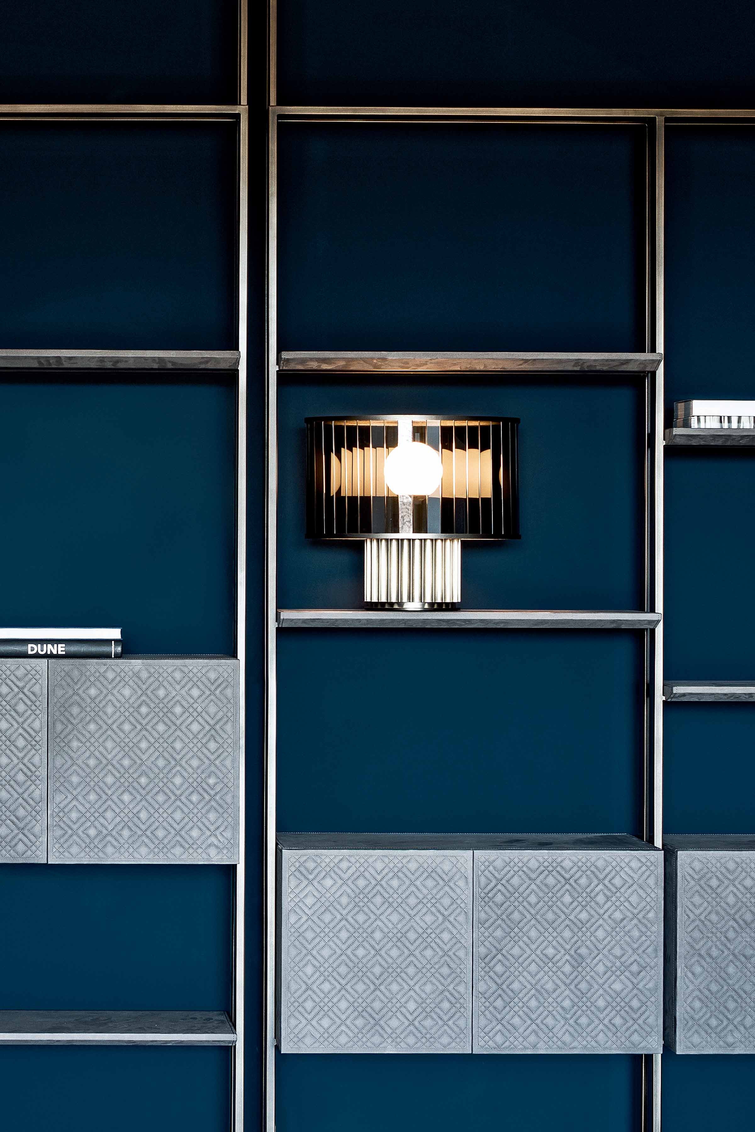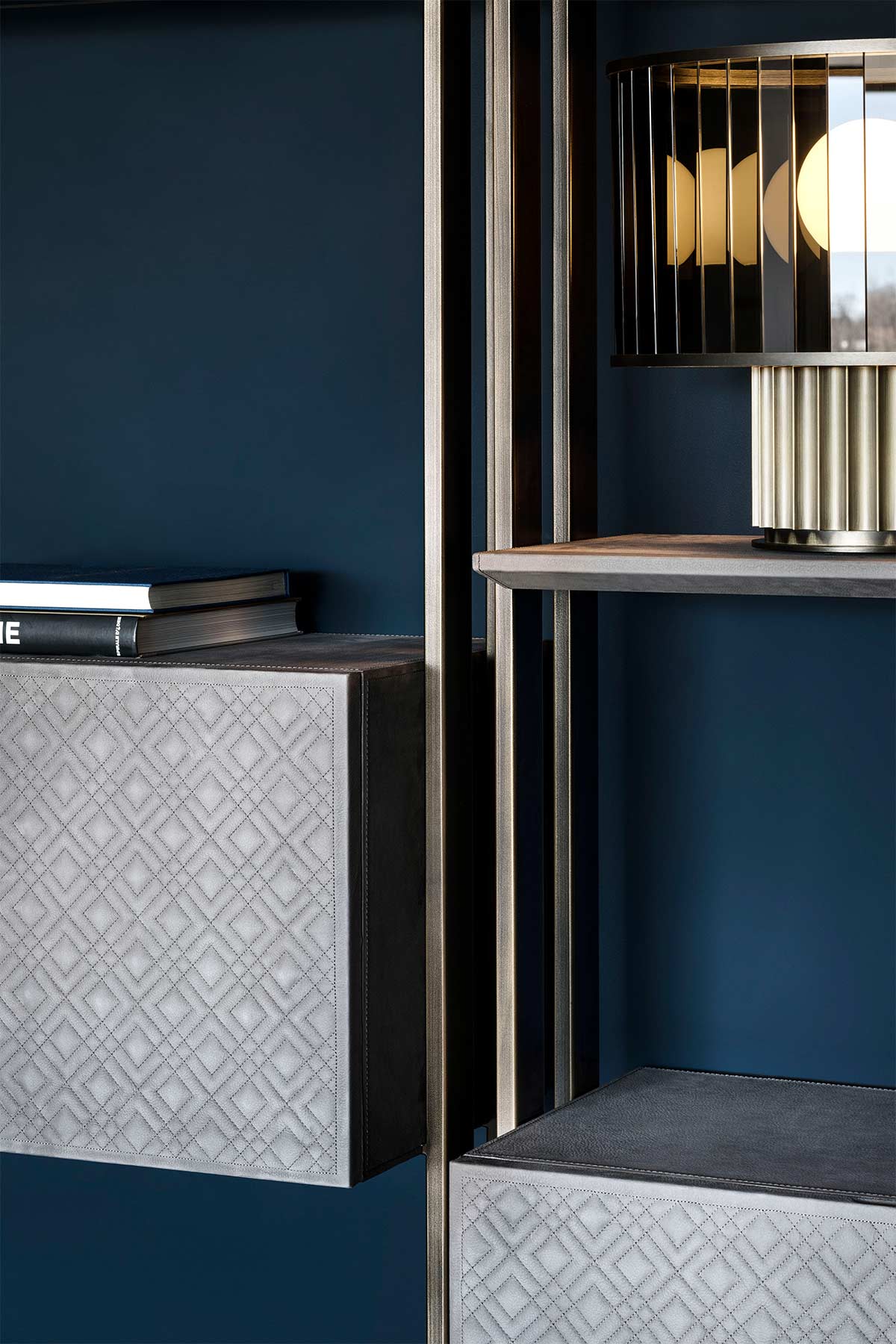 Bookshelves with bronze or dark chrome varnished structure, available in different configurations. Shelves available in leather or marble. Box upholstered in leather and available with or withour stitching and with front only or back and front opening.