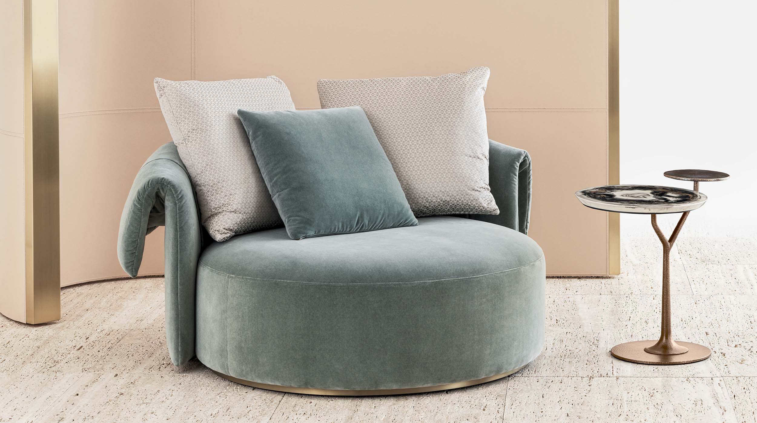 Extreme softness, noble yarns, natural luster. The first chapter of the collection, Velvet & Chenille, is a tribute to the nobility of natural fibers. Within this book, Rugiano’s research celebrates the classic elegance of cotton velvet, enriching it with ultra-luxury offerings in Cashmere and Alpaca—ideal for those seeking a sensation of absolute comfort and enveloping warmth. The chenilles, crafted from natural cotton and viscose yarns, offer shimmering reflections and a soft hand, while ensuring ideal durability for sophisticated daily use. A selection designed for environments that make the preciousness of materials their distinctive hallmark.