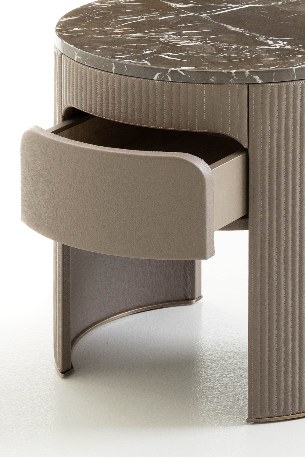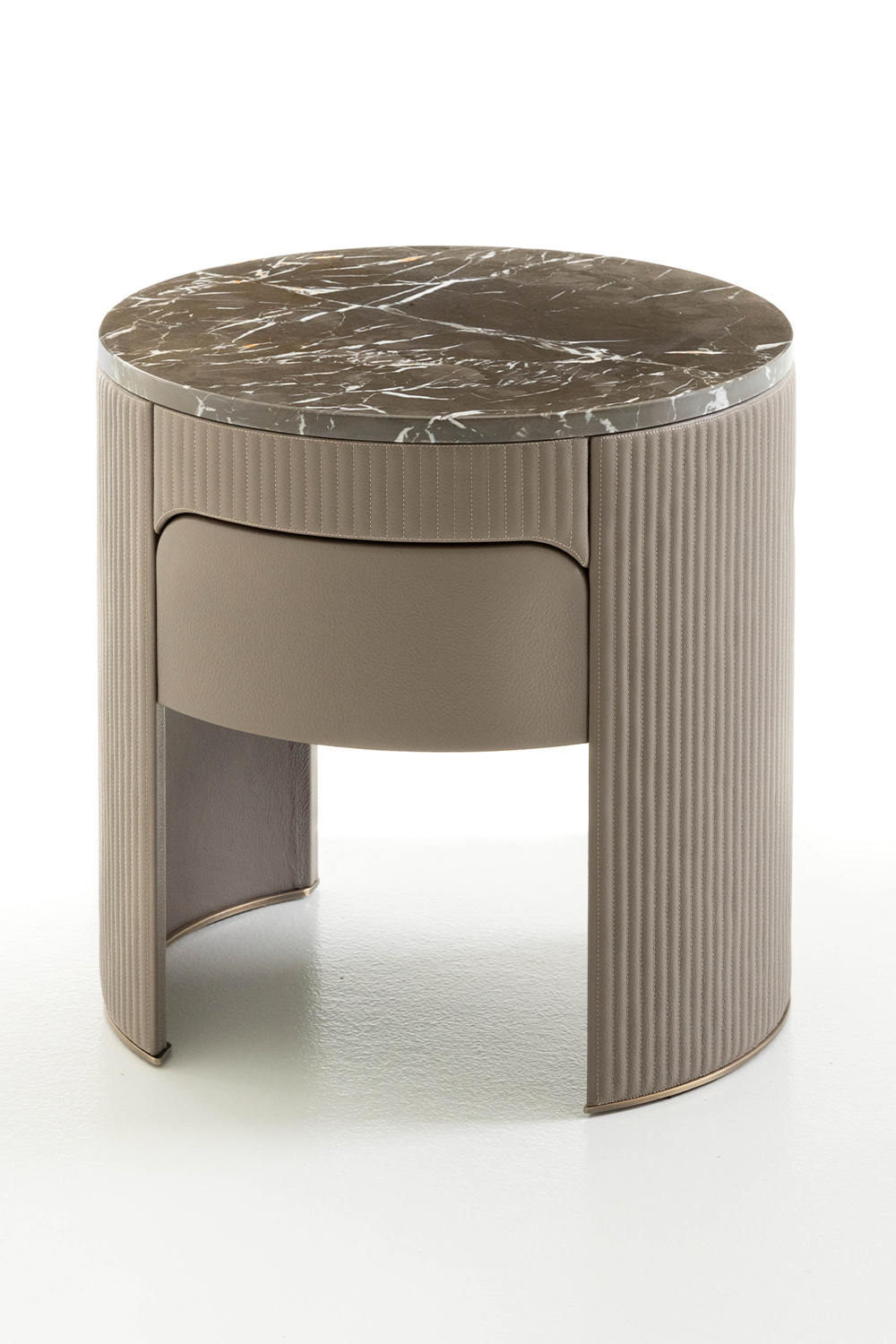 Soft, continuous surfaces define Vogue, a fully curved nightstand upholstered in leather and enriched by refined vertical detailing that sets its visual rhythm. Its rounded lines evoke a sense of feminine, modern elegance, conceived for sophisticated and contemporary bedroom environments.