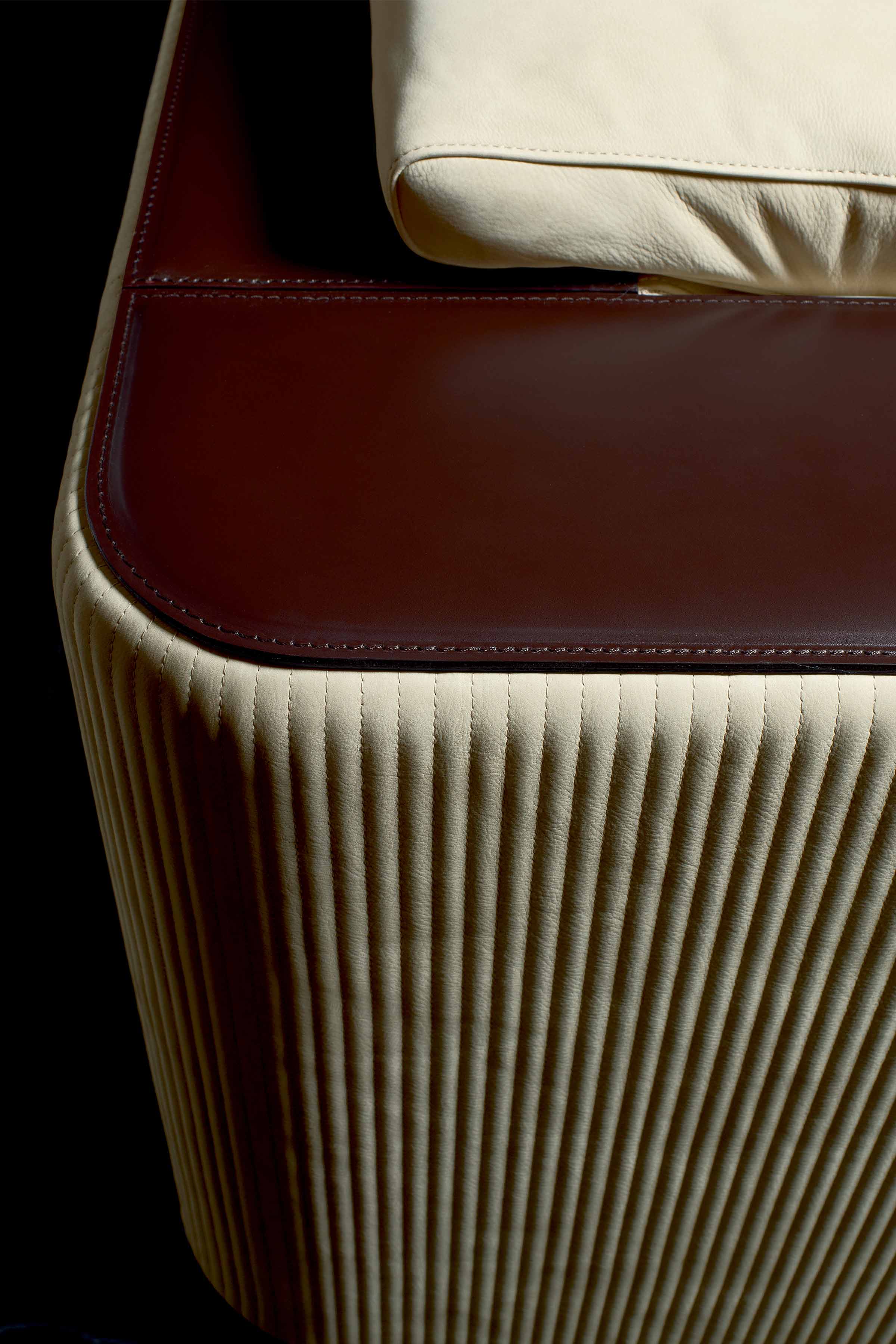 Range of modular upholstered furniture with saddle leather or nubuck detail. Structure available plain or with “baguette” stitching.