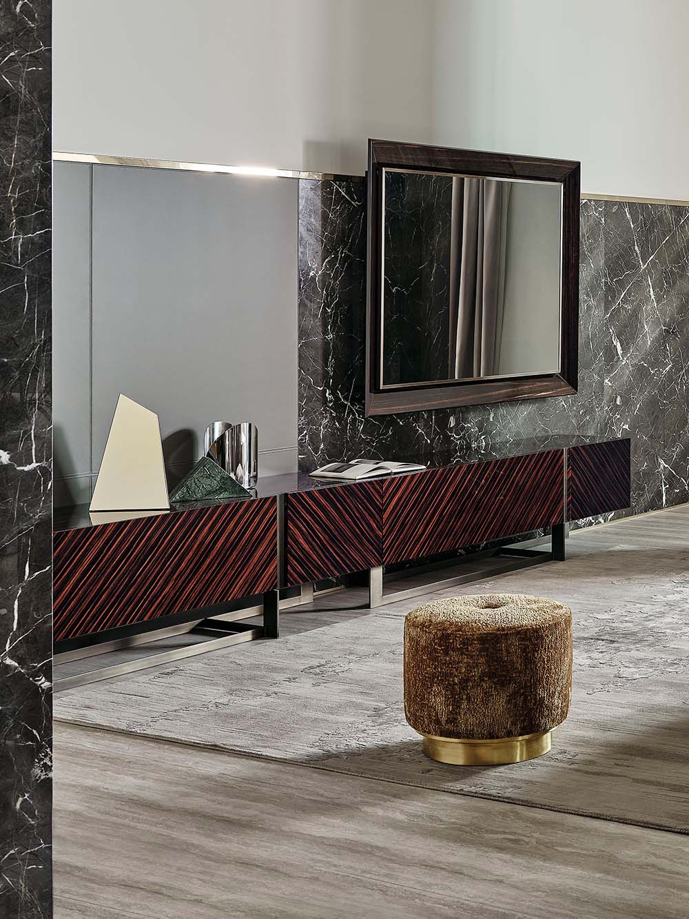 TV cabinet. Base finishes in bronze, chrome or black chrome. Structure in ebony or upholstered in leather, Doors in ebony, or upholstered in leather, or hand-painted.