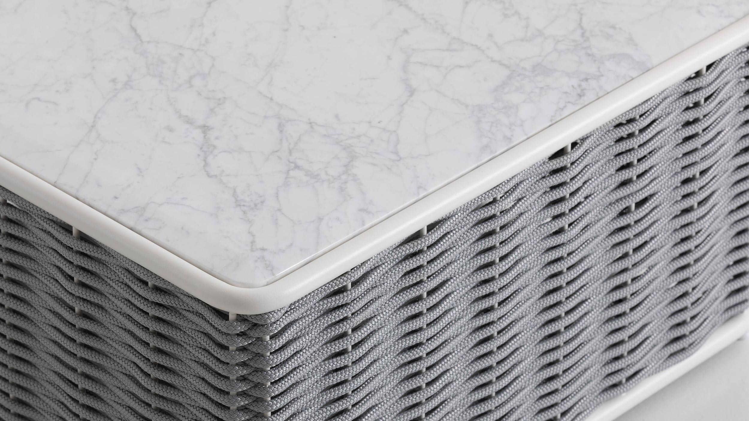 The Marina coffee table stands out for its geometric, compact design, perfectly blending into the most elegant outdoor spaces. The entire structure is hand-woven with rope, following the distinctive aesthetic of the Marina collection, giving the piece a refined and tactile character while balancing structural solidity with visual lightness.