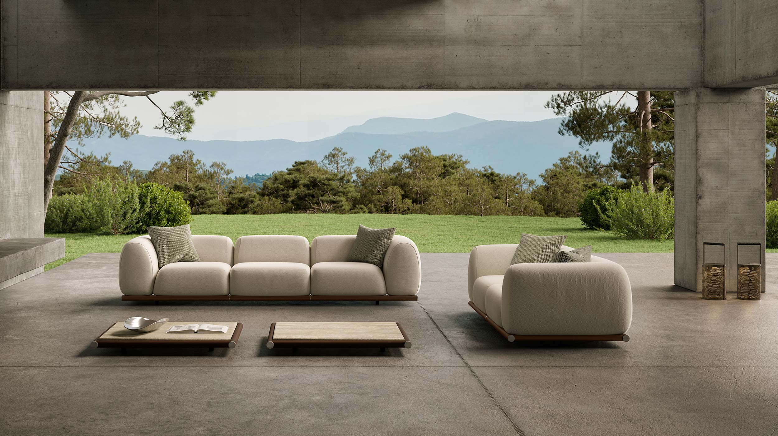 Amalfi is the sofa that redefines contemporary outdoor living, with generous volumes and a clean, essential aesthetic designed to harmonize with its surroundings — discreet yet assertive. Its soft, monolithic lines rest on a solid mahogany base, enriched by chrome-finished details that gently reflect natural light.