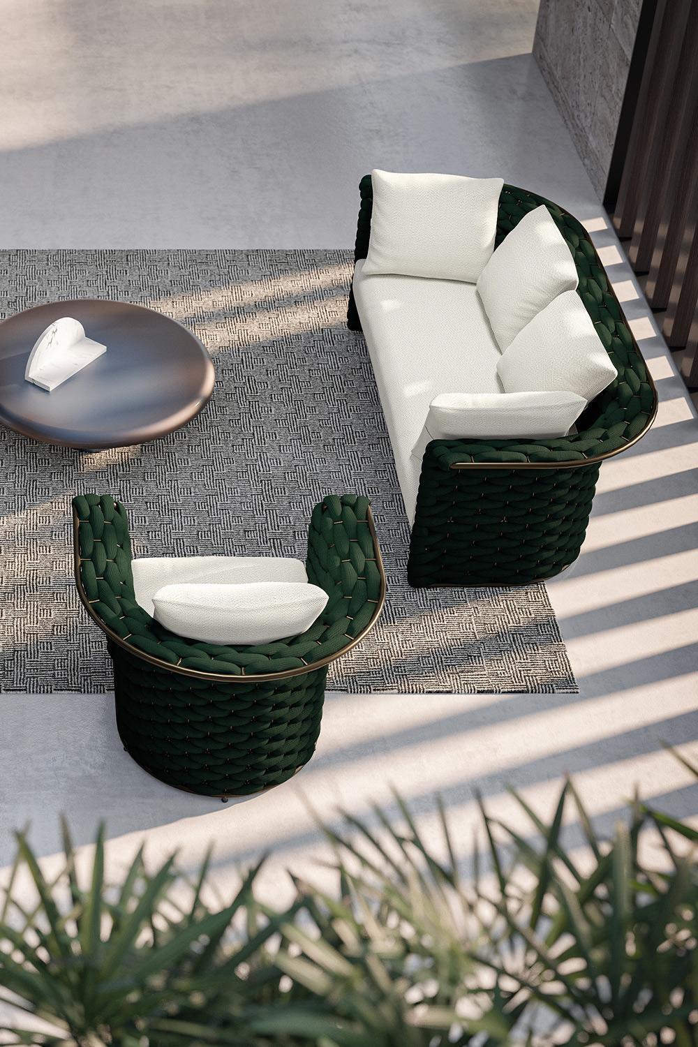Marina Soft is the most embracing evolution of the Marina collection, reinterpreting Rugiano’s iconic weave with a more fluid and tactile language. The star of this version is the tubular element, running along the entire outdoor bronze metal structure in a continuous, sculptural motion, creating a three-dimensional weave with a soft, sophisticated character.