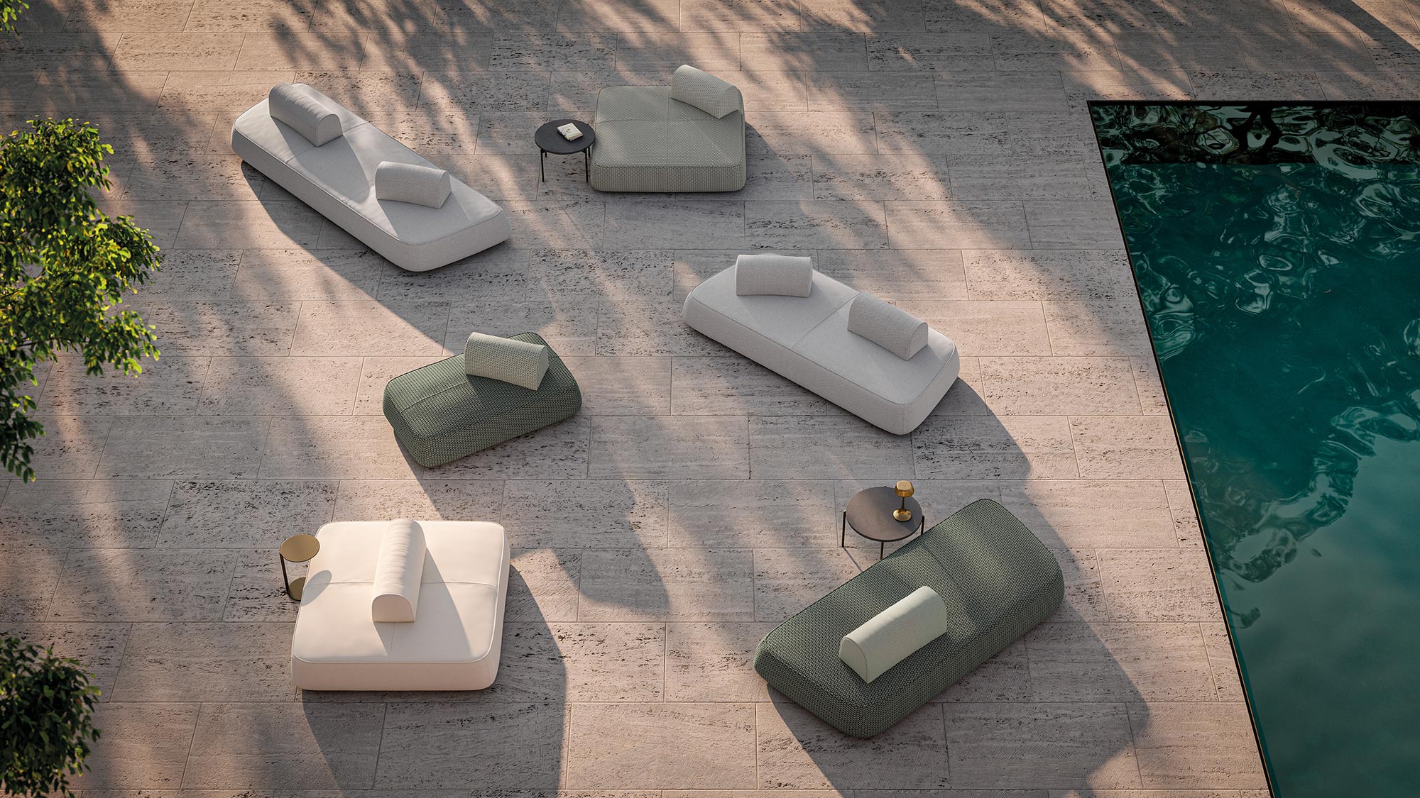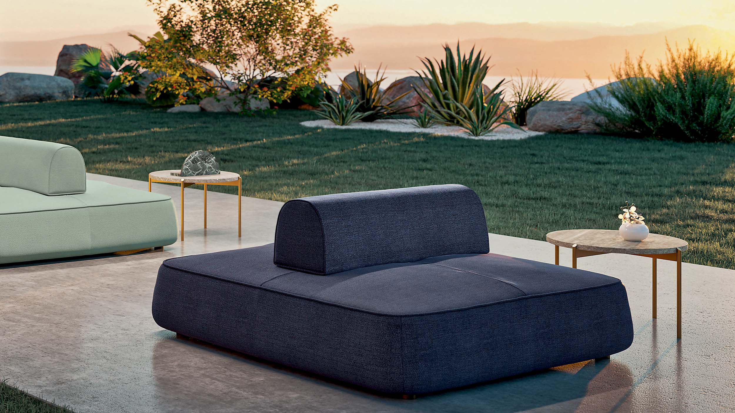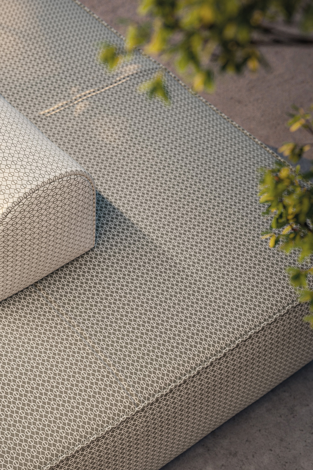 The Melody Spring sofa reinterprets contemporary outdoor living with an innovative and versatile approach. Its defining feature is the removable backrest, a design element that can be repositioned effortlessly, transforming the seating layout with a simple gesture. The result is a fluid, adaptable piece that responds to the moment’s needs—from social conversation to relaxed lounging. The geometric structure, understated yet solid, supports generous volumes and soft cushions designed to ensure comfort and durability in outdoor environments.