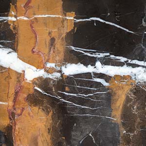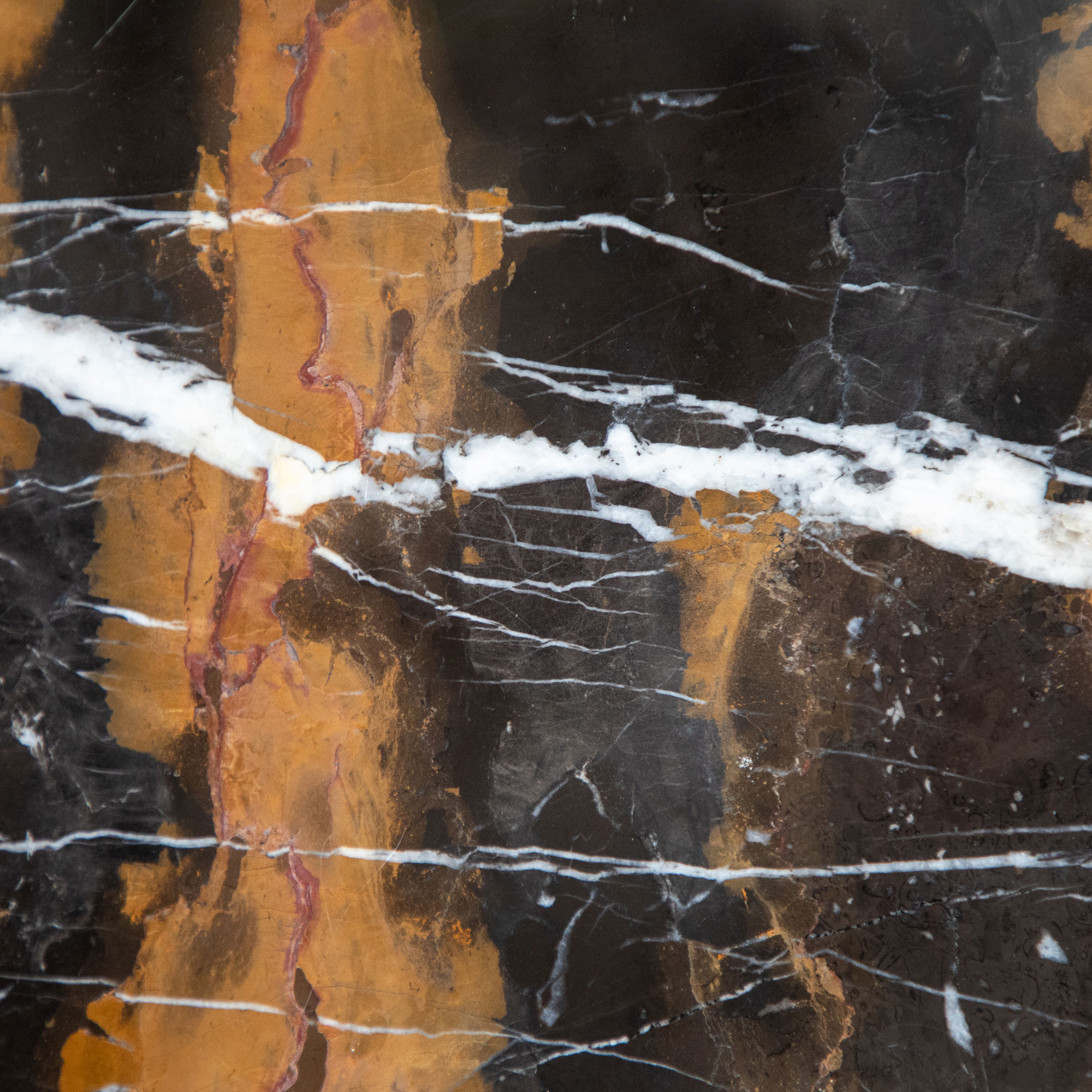Uno dei marmi più iconici e grafici, caratterizzato da un fondo nero assoluto solcato da venature geometriche arancio, oro e bianche. Ideale per piani di tavoli che definiscono lo status dello spazio circostante.