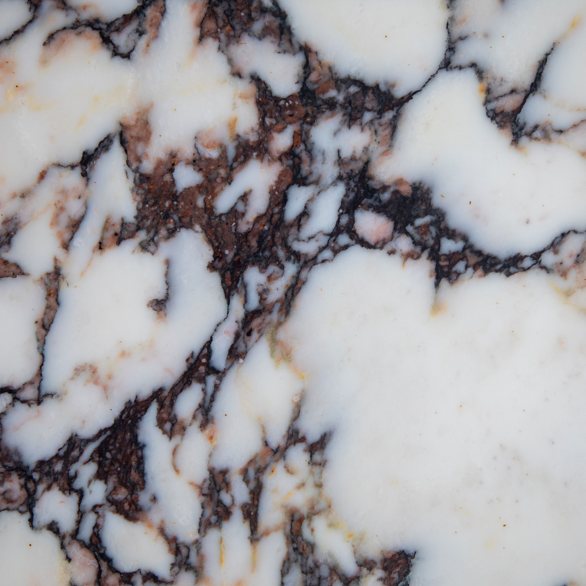 Marmo brecciato dal fondo bianco-crema con venature audaci e spettacolari nelle tonalità del viola e del bordeaux. Trasforma il tavolo in un pezzo d'arredo iconico dalla forte componente scultorea.
