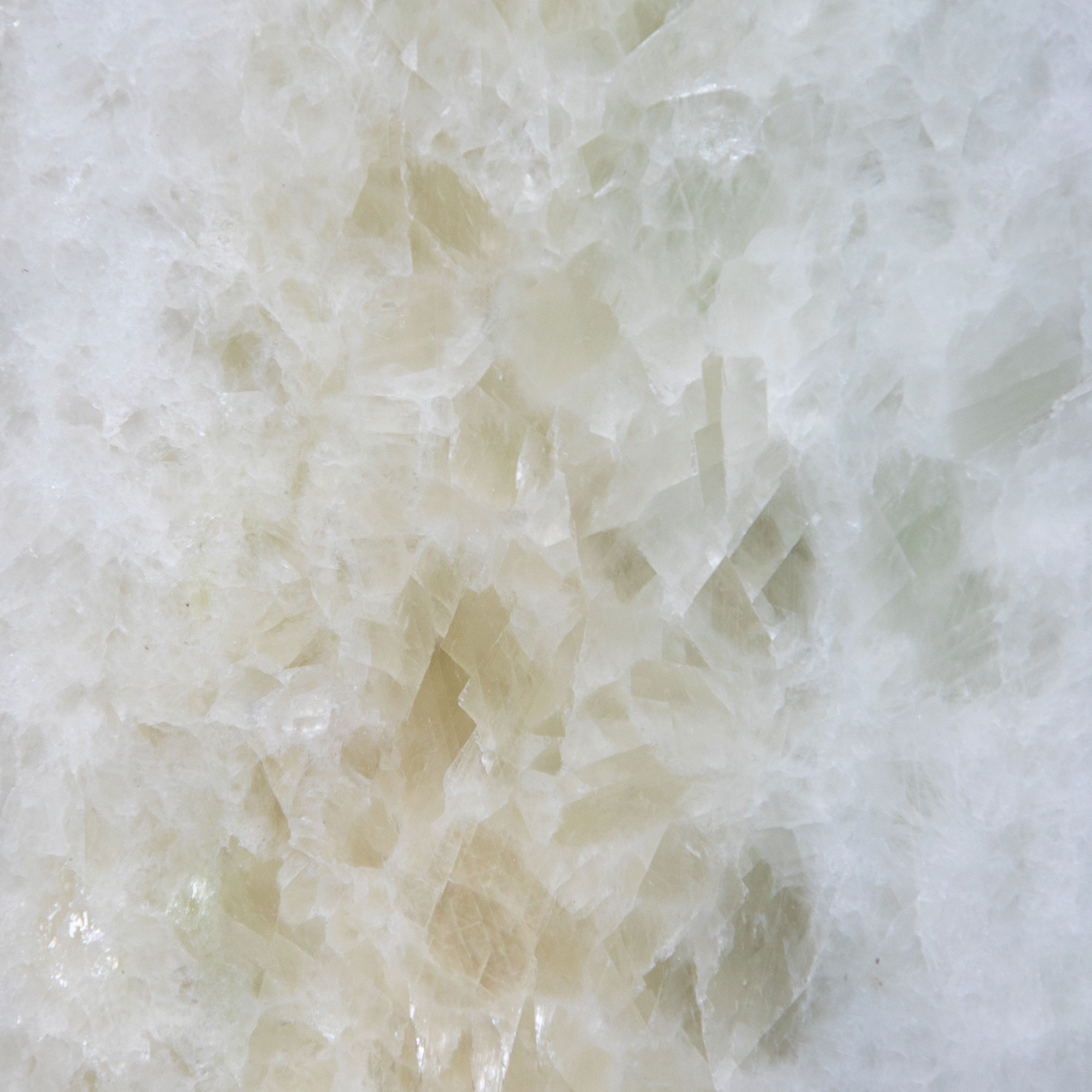 Una calcite preziosa dalle tonalità eteree e traslucide. Il fondo neutro, arricchito da sfumature cristalline delicate, conferisce ai tavolini una leggerezza visiva e una luminosità senza pari.