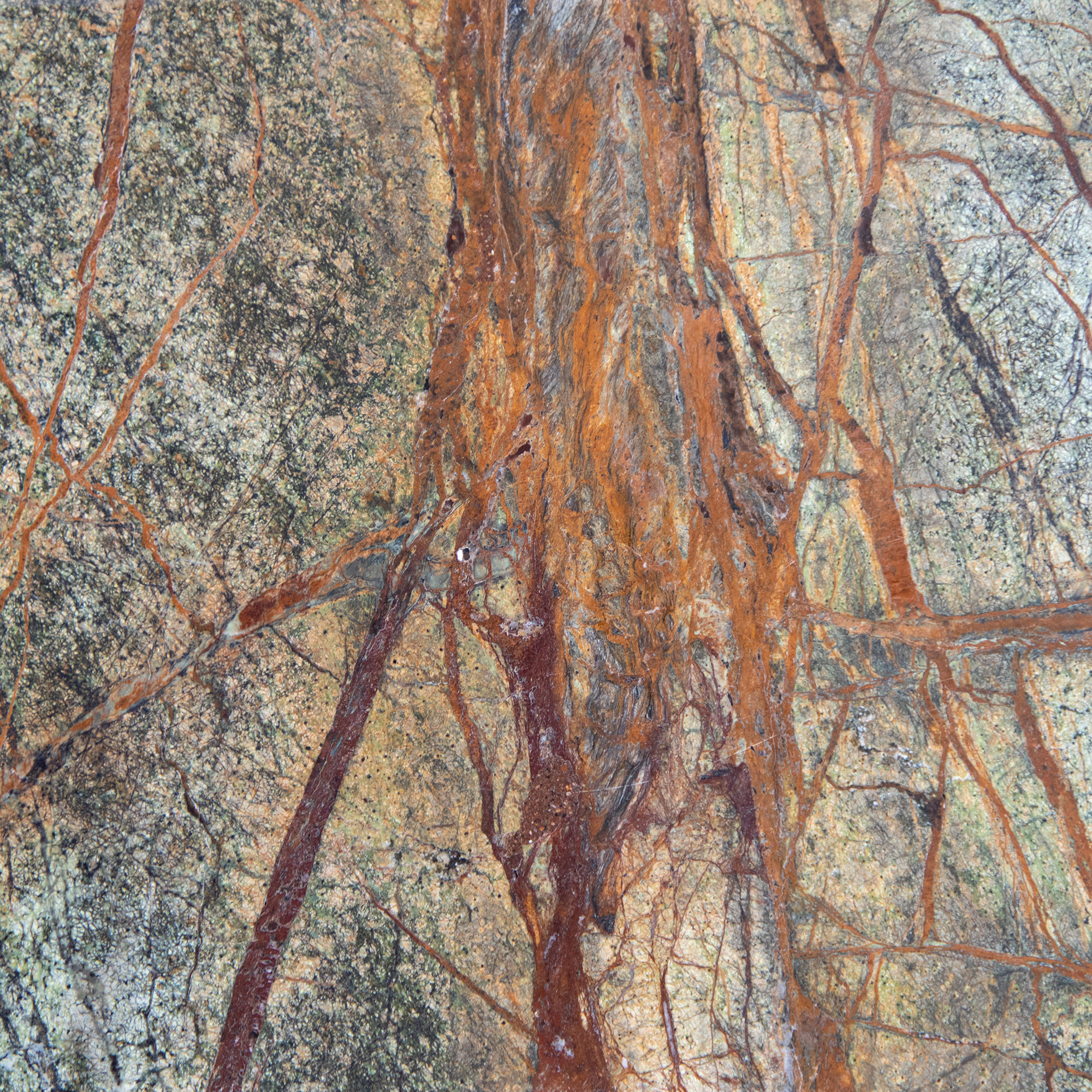Marmo dalla texture fitta e intricata che ricorda l'intreccio di una foresta. I toni del verde scuro e del bruno creano un piano d'appoggio materico e resistente, ideale per un design d'interni organico.