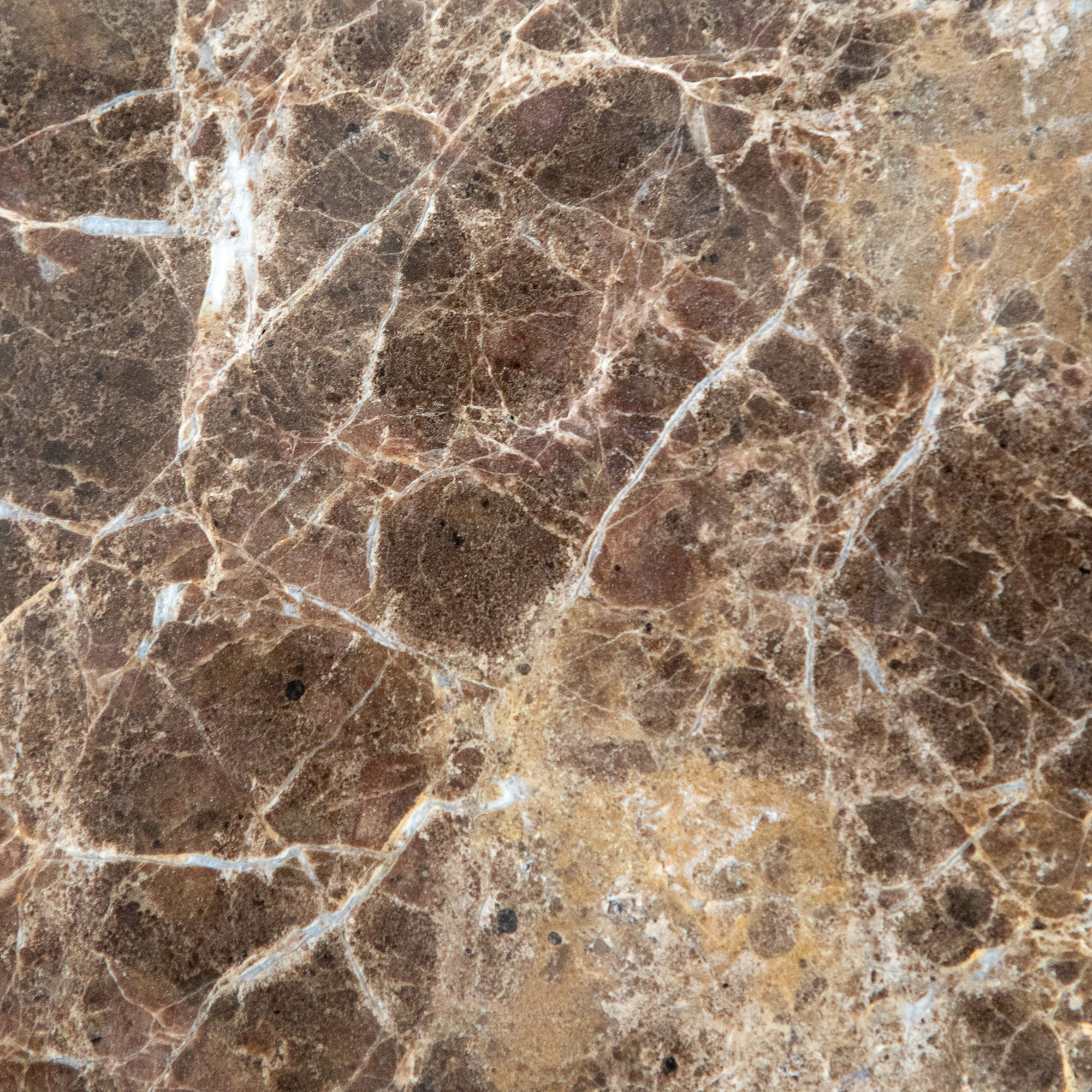 Marmo italiano dalla struttura brecciata con frammenti minerali a vista. La base grigio medio rende ogni piano del tavolo un pezzo unico di artigianato naturale.