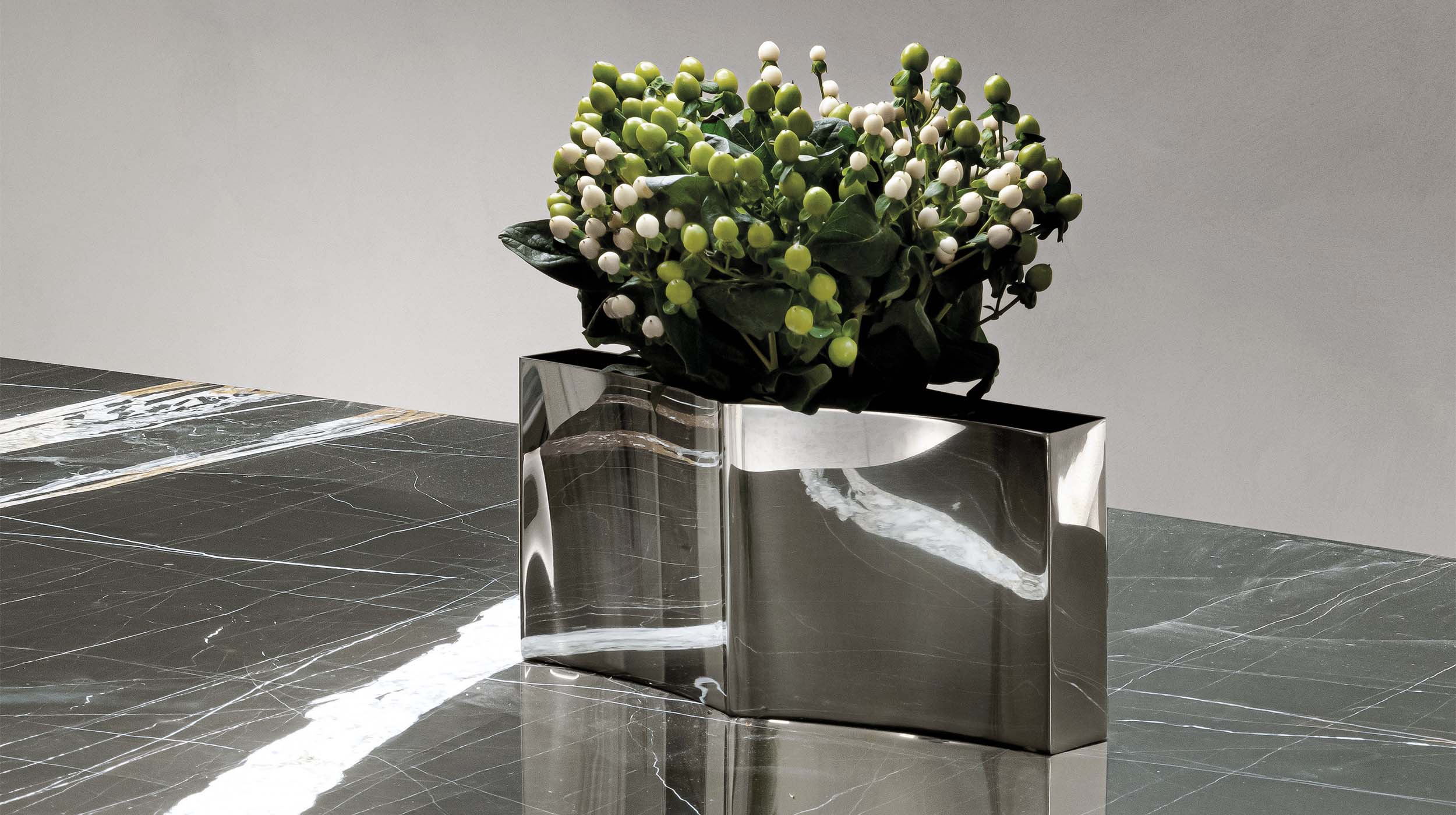 Marmo dal carattere deciso, con stratificazioni fluide di verde e grigio. Trasforma il piano del tavolo in un elemento naturale dinamico e di grande valore decorativo.