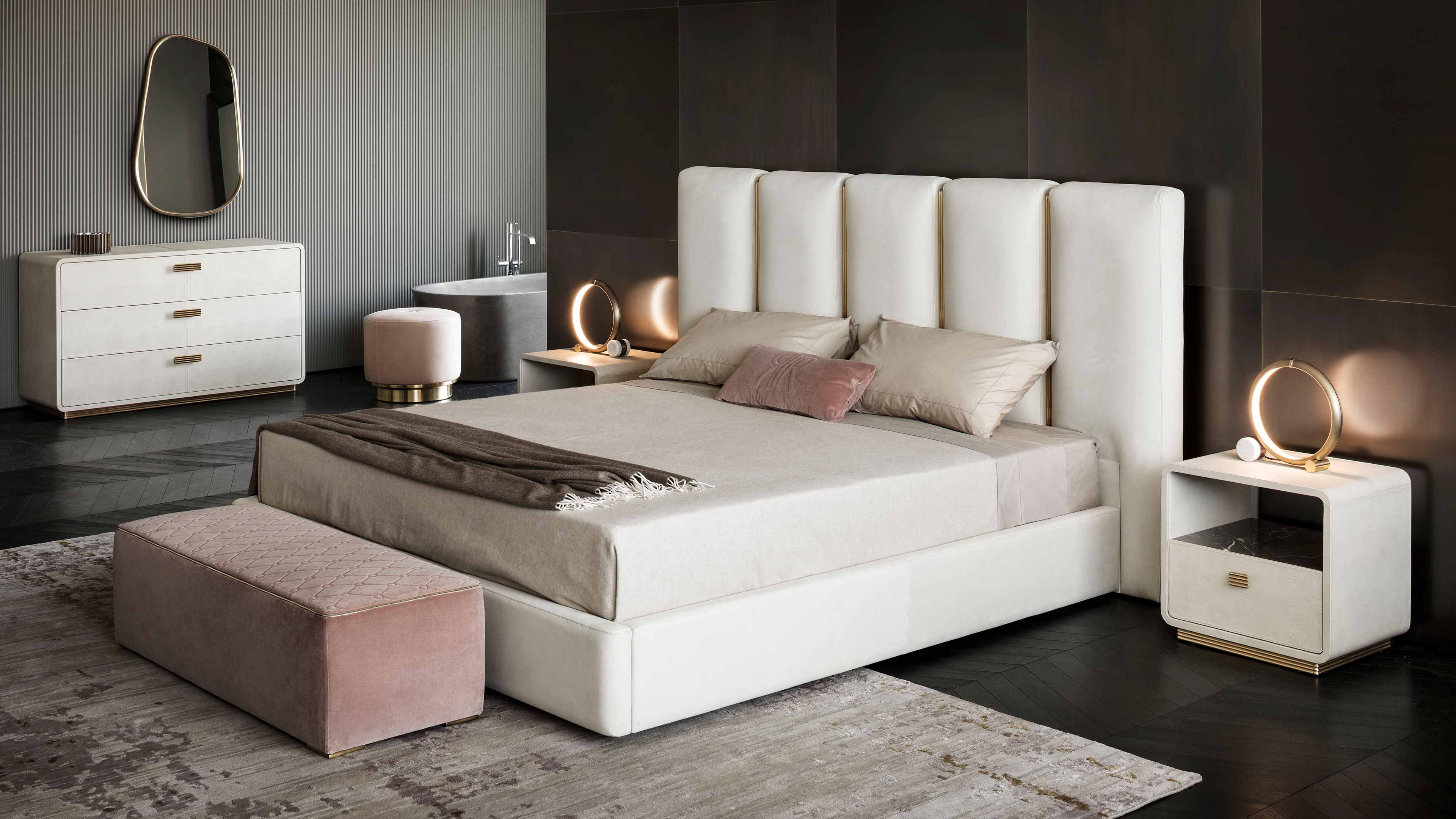Comò a 3 cassetti rivestito in pelle con piano in marmo e dettagli in ottone spazzalato o bronzo.