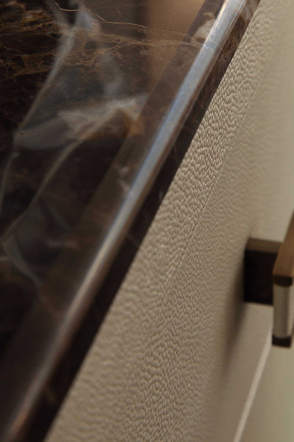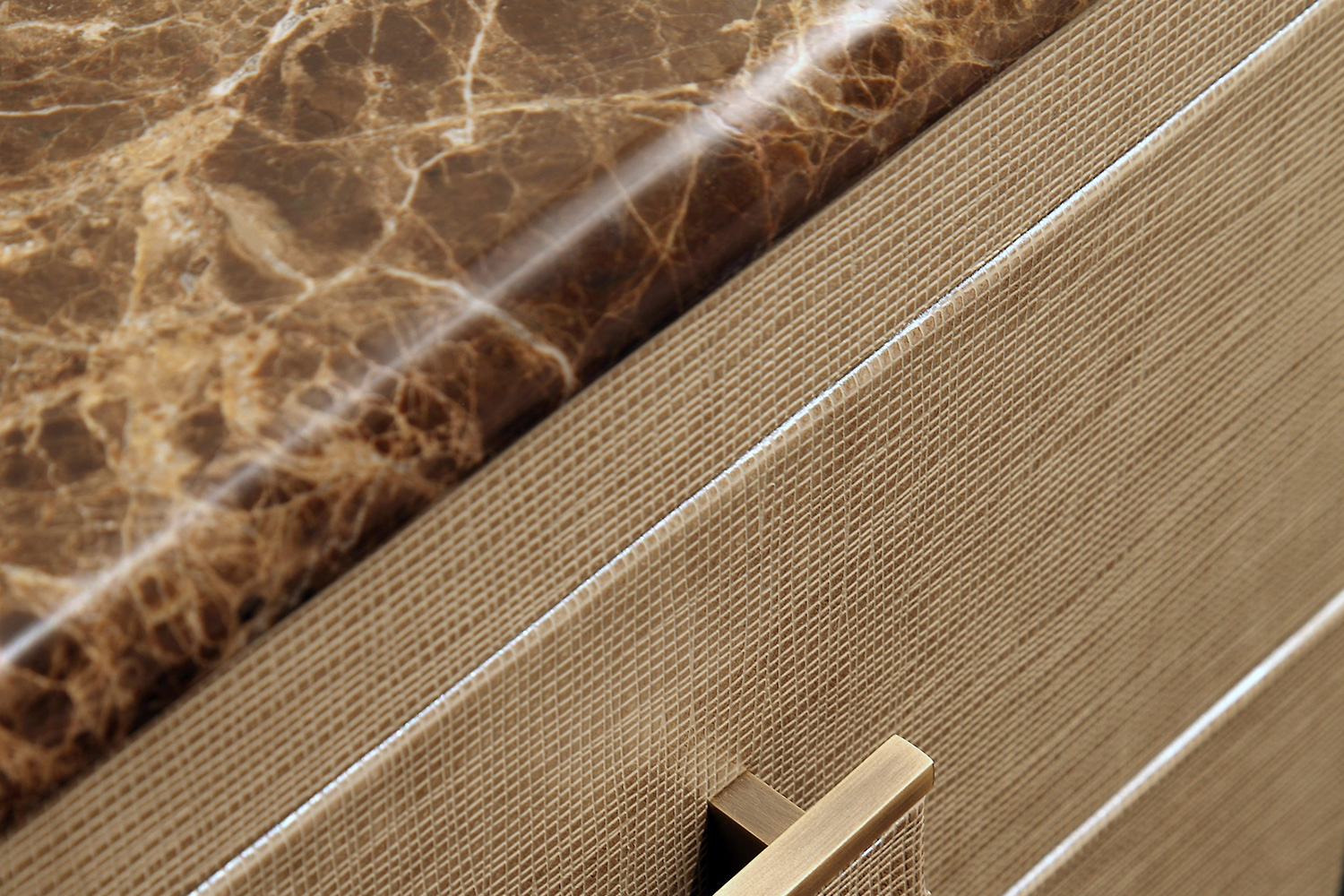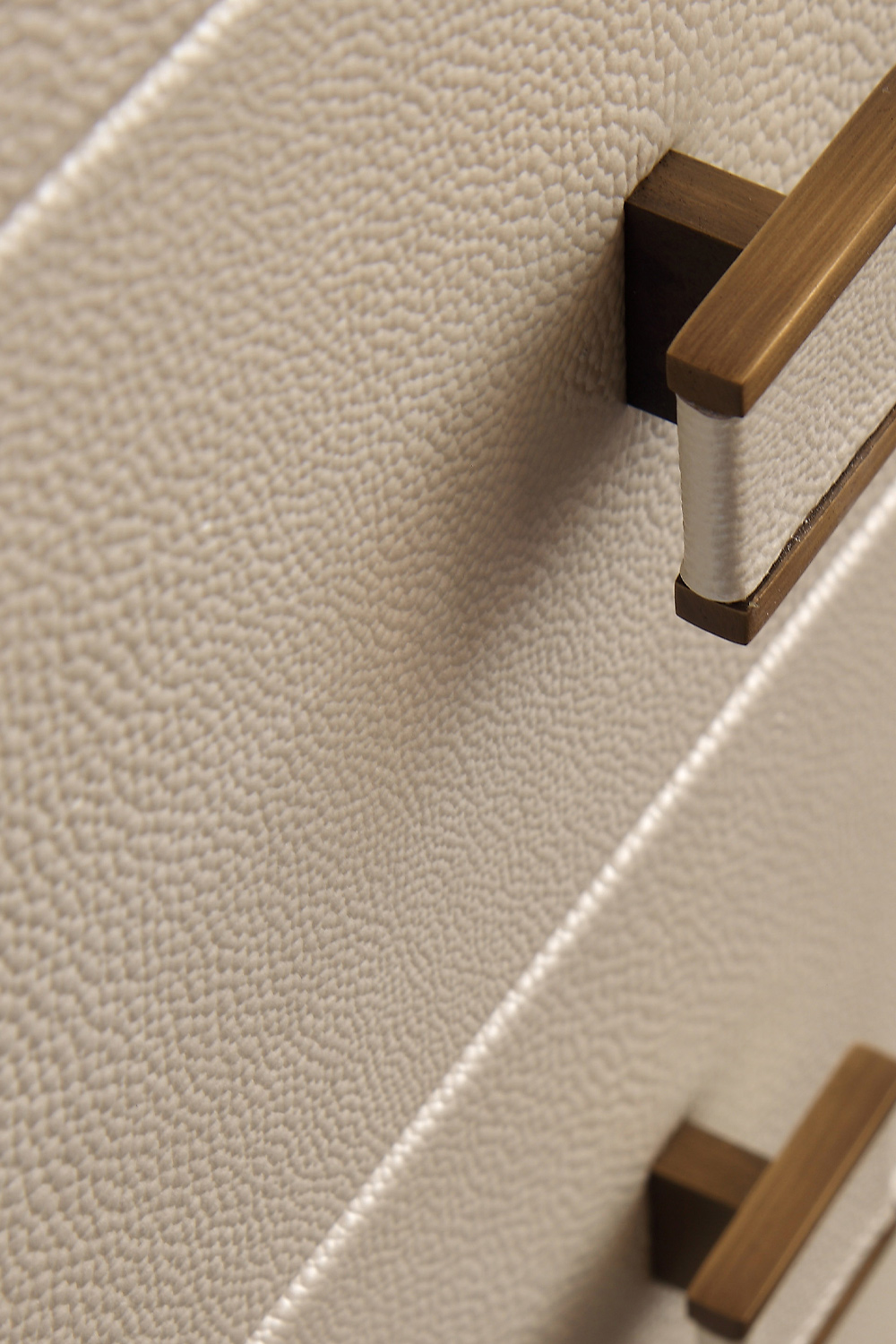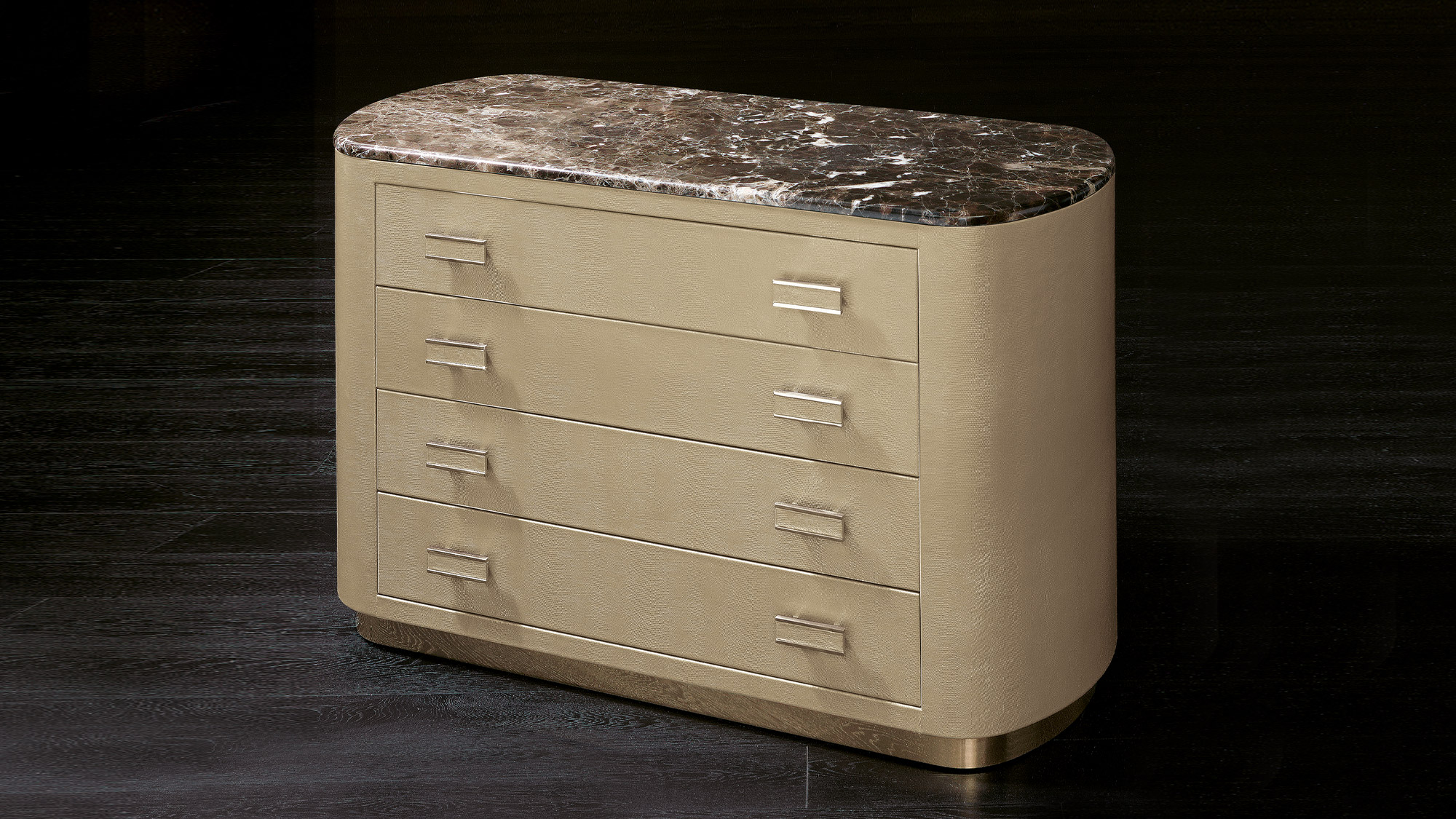 La fronte dei cassetti è arricchita da una lavorazione testurizzata che cambia a seconda della pelle scelta, offrendo giochi di rilievo e profondità visiva. Le maniglie in ottone bronzato – lineari, leggere, perfettamente integrate – introducono un dettaglio grafico contemporaneo che valorizza l’insieme senza interrompere la pulizia estetica. La base in metallo, coordinata alle finiture, completa il volume con un tratto sottile e prezioso.