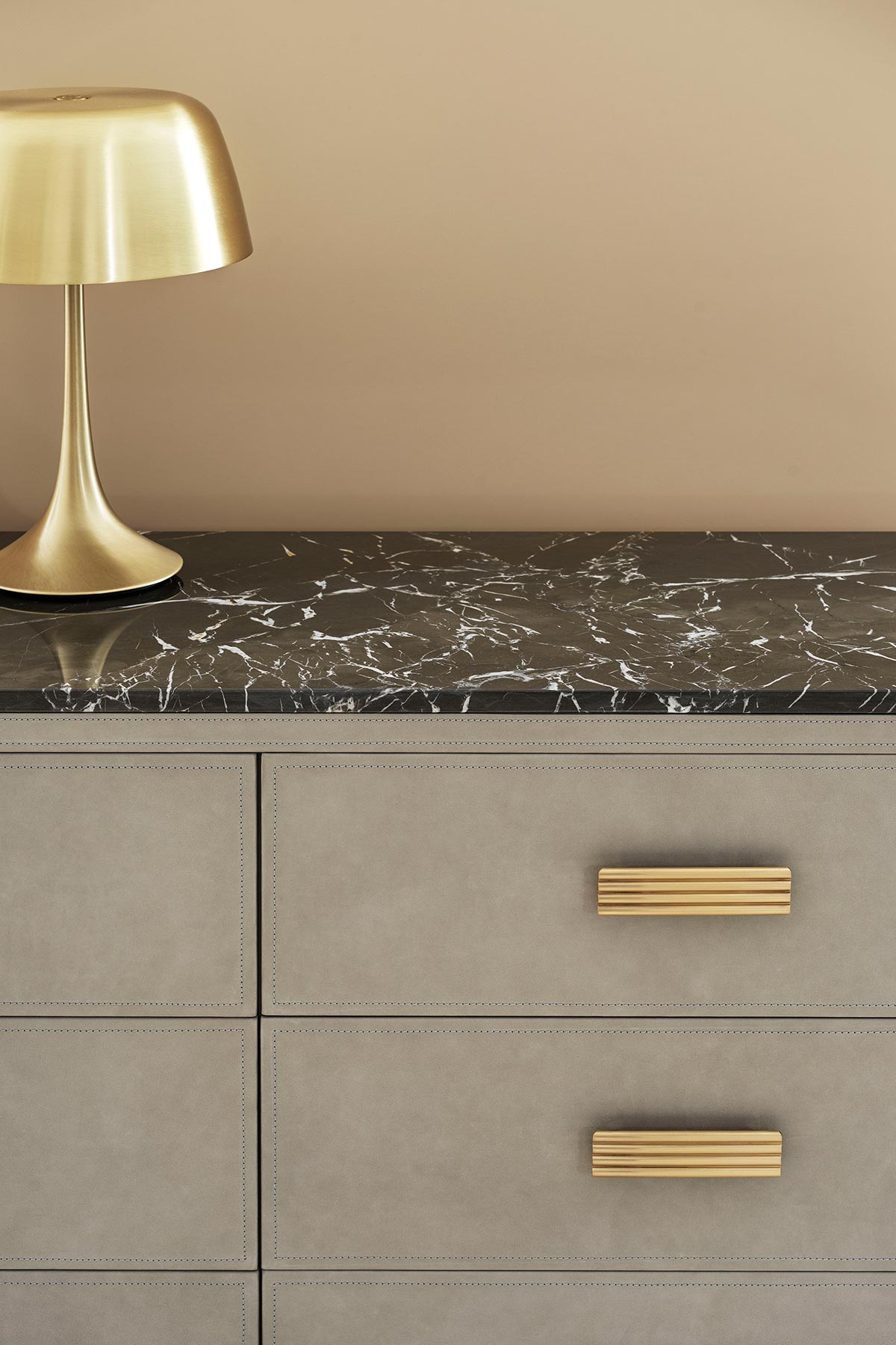 Comò a 6 cassetti in due diverse larghezze, rivestito in pelle con piano in marmo e dettagli in metallo.