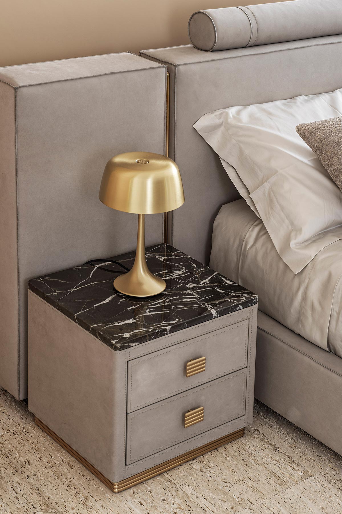 Collezione di comodini a 2 o 3 cassetti in due diverse larghezze, rivestito in pelle con piano in marmo e dettagli in metallo.