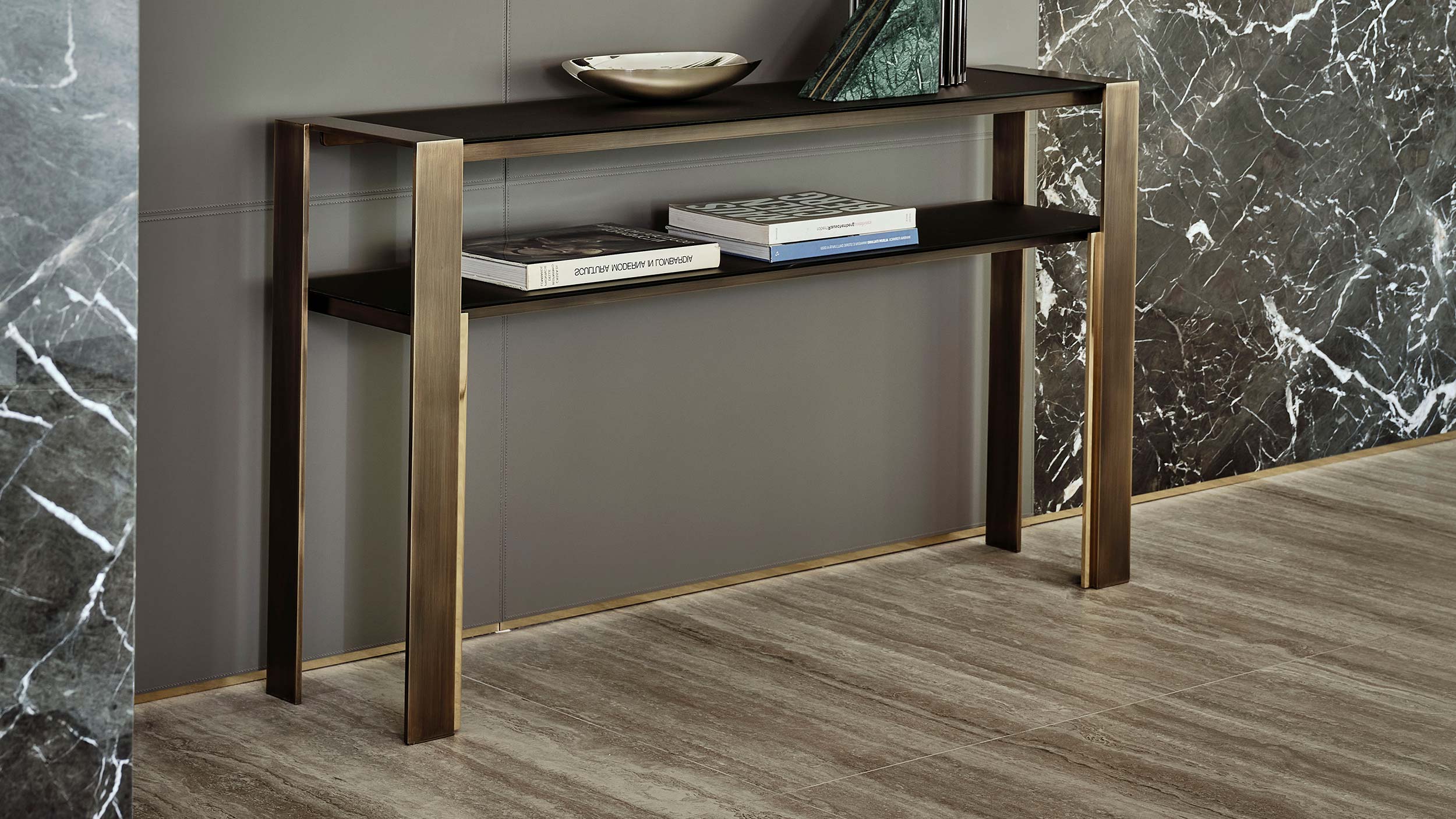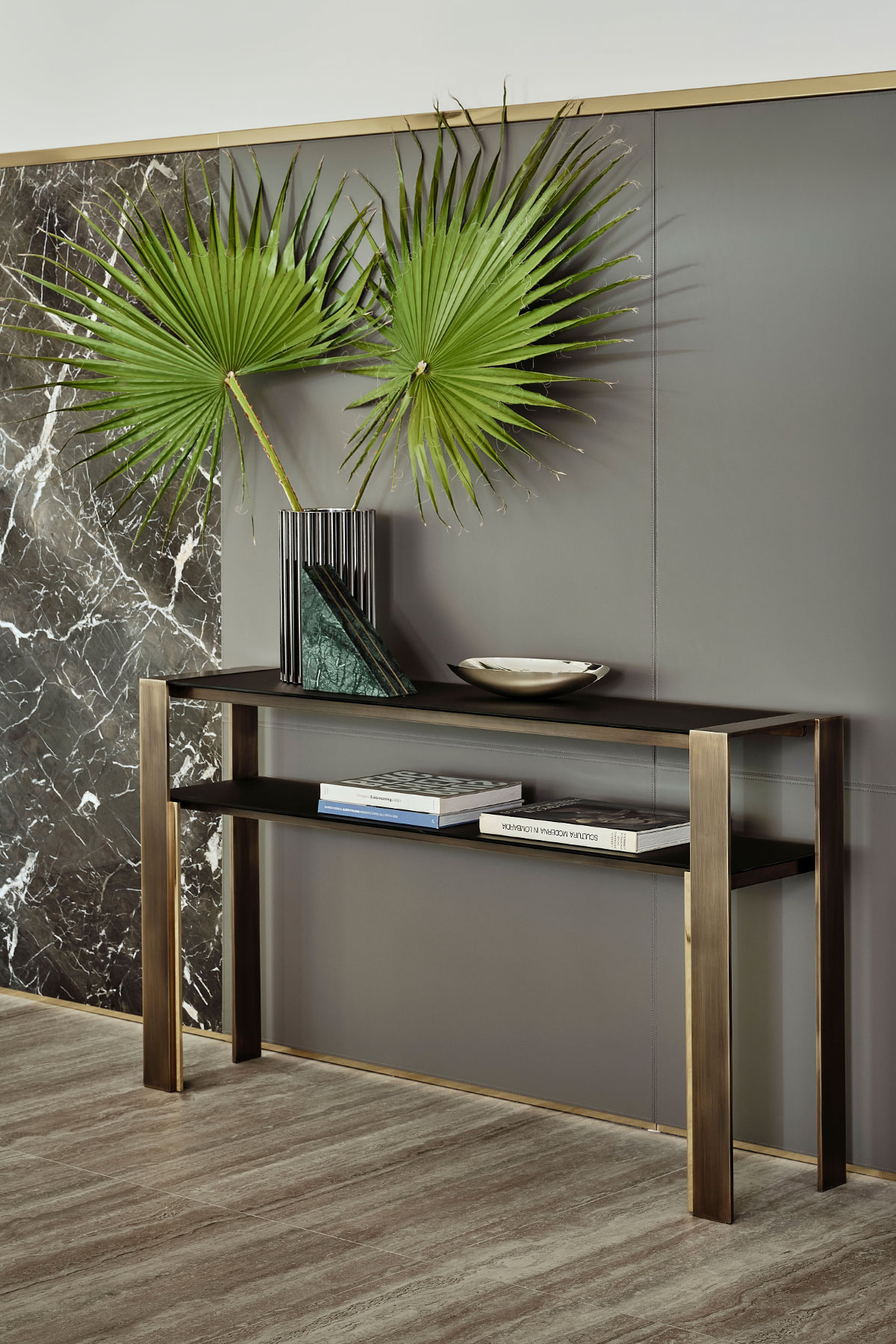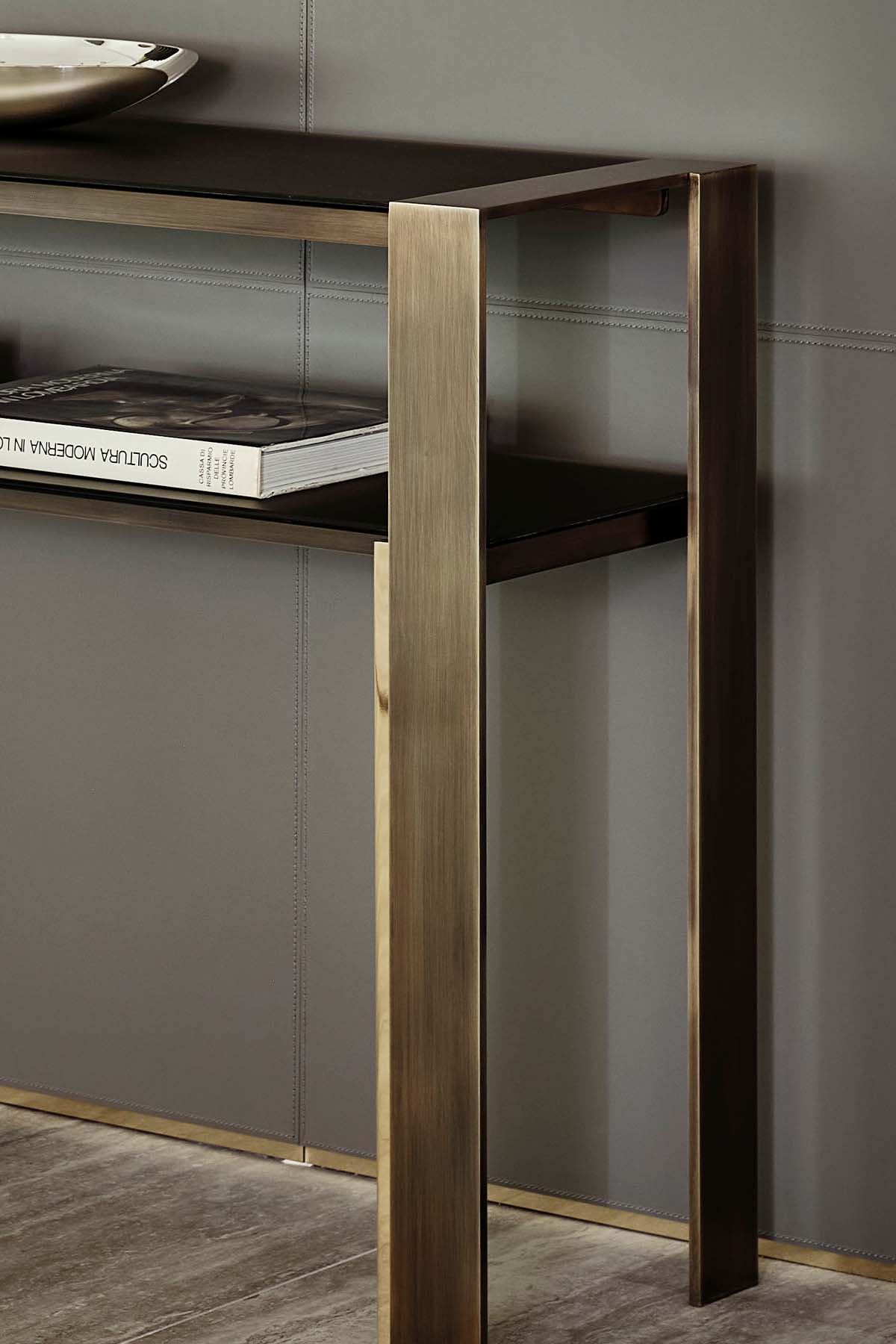 Linee essenziali compongono la console. Due piani in vetro incorniciati dalla struttura in bronzo.