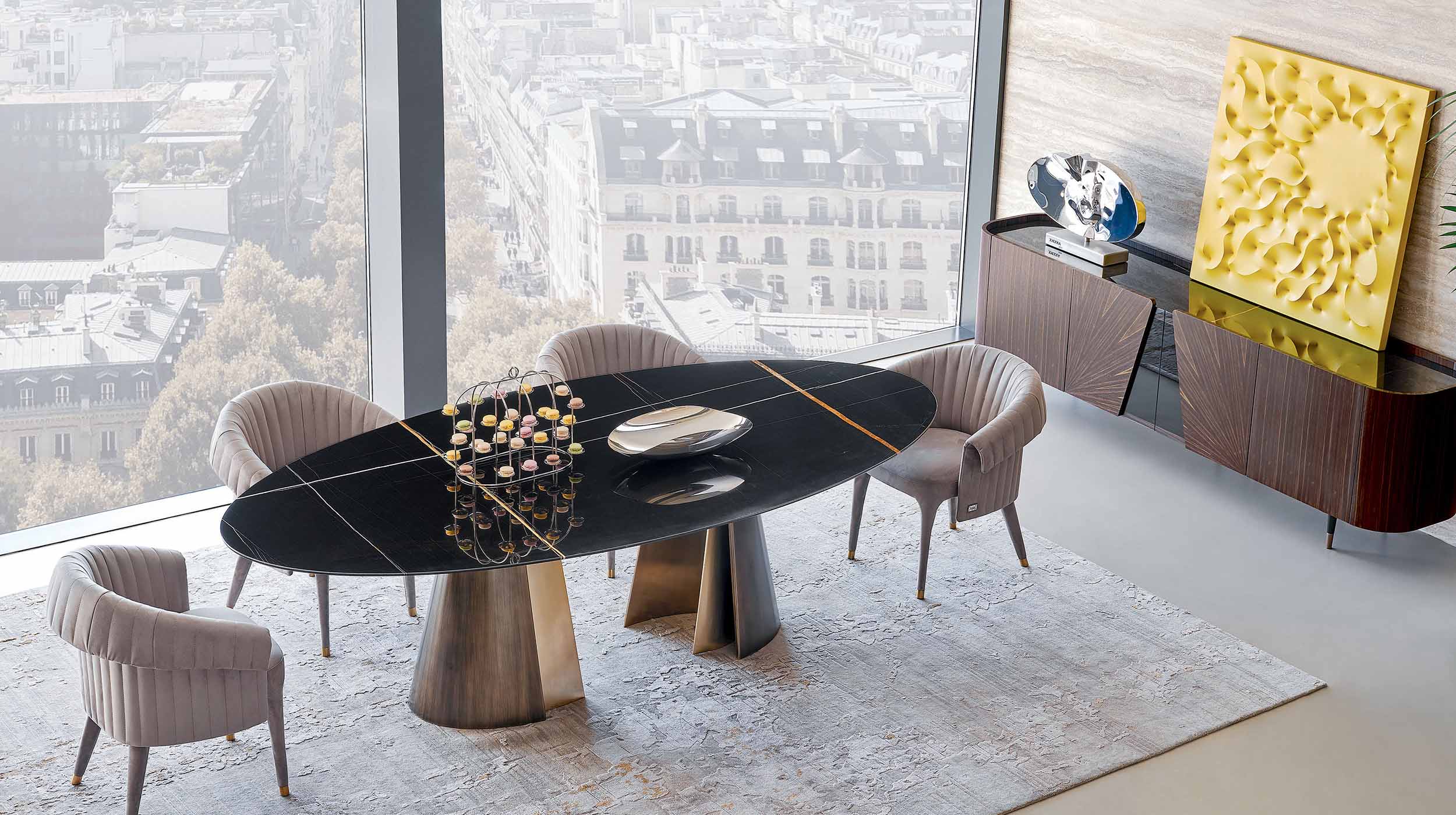Un'essenza magnetica caratterizzata da uno sfondo ceruleo profondo, solcato da venature ramate e dorate. Il piano del tavolo diventa un punto focale di grande impatto visivo, ideale per ambienti che ricercano un lusso distintivo e monumentale.