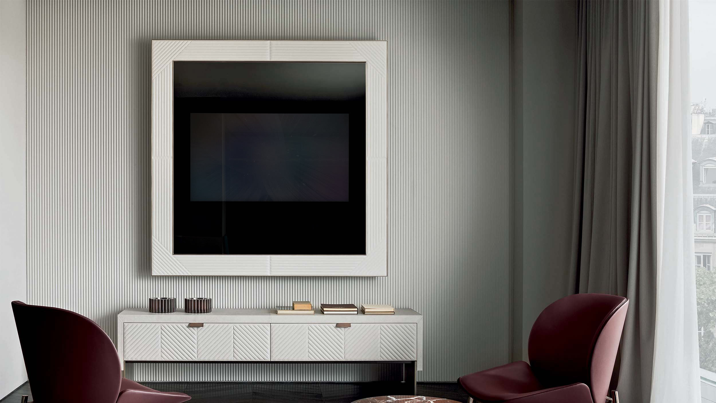 Mobili porta tv a parete. Dettagli, acciaio o bronzo. Cornice rivestita in pelle con ricamo.