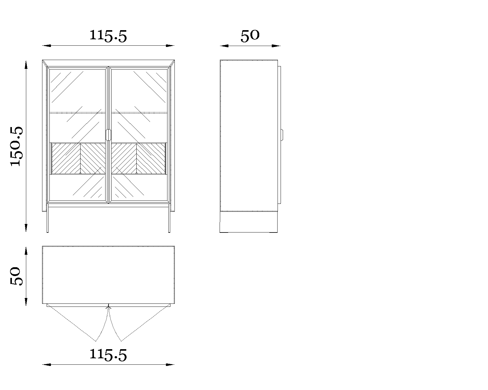 Vetrina con dettagli in bronzo. Struttura rivestita in pelle ed ante in vetro.