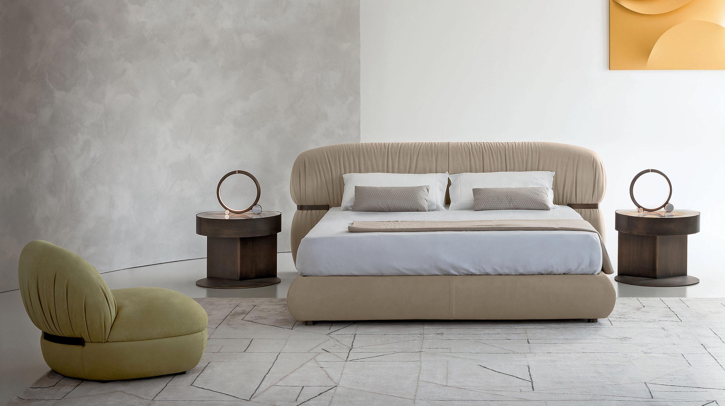 Inca è un comodino che interpreta con eleganza la filosofia Rugiano: materiali preziosi, forme pure e un equilibrio misurato tra design e artigianalità. Perfetto per ambienti notte sofisticati, porta nella stanza una nota di carattere, calda e contemporanea.
