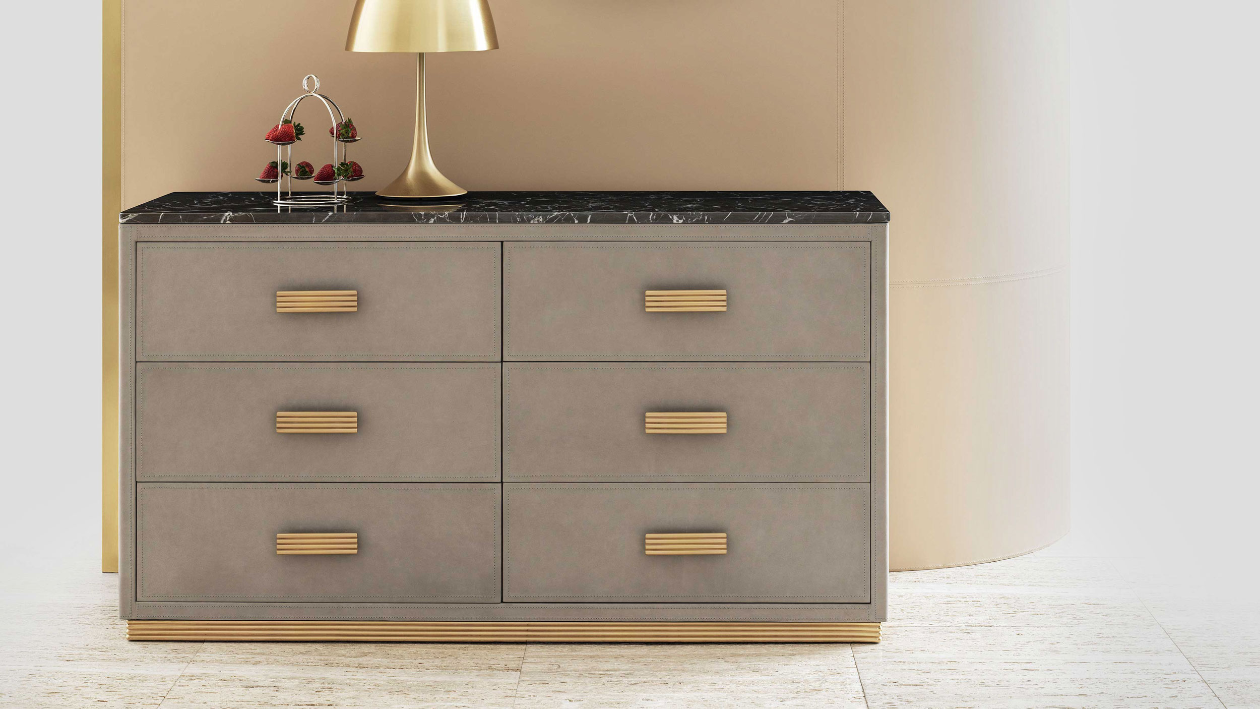 A caratterizzare con decisione il comò sono le maniglie in ottone bronzato, elementi iconici dal profilo rigato che donano personalità e continuità stilistica all’intera collezione. L’incontro tra i materiali crea un equilibrio armonioso: la morbidezza della pelle dialoga con la matericità del marmo e con la brillantezza calda del metallo, dando vita a un’estetica elegante, contemporanea e immediatamente riconoscibile. La base, anch’essa in ottone bronzato, ribadisce la solidità del disegno e conferisce un senso di leggerezza visiva pur mantenendo un carattere autorevole.