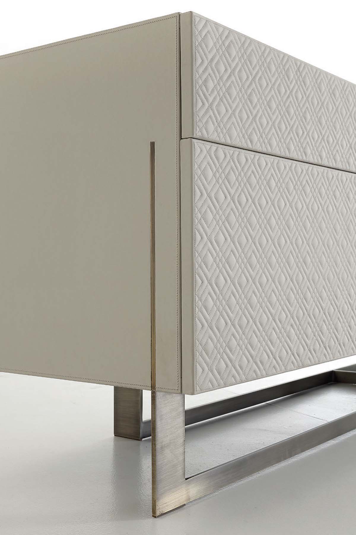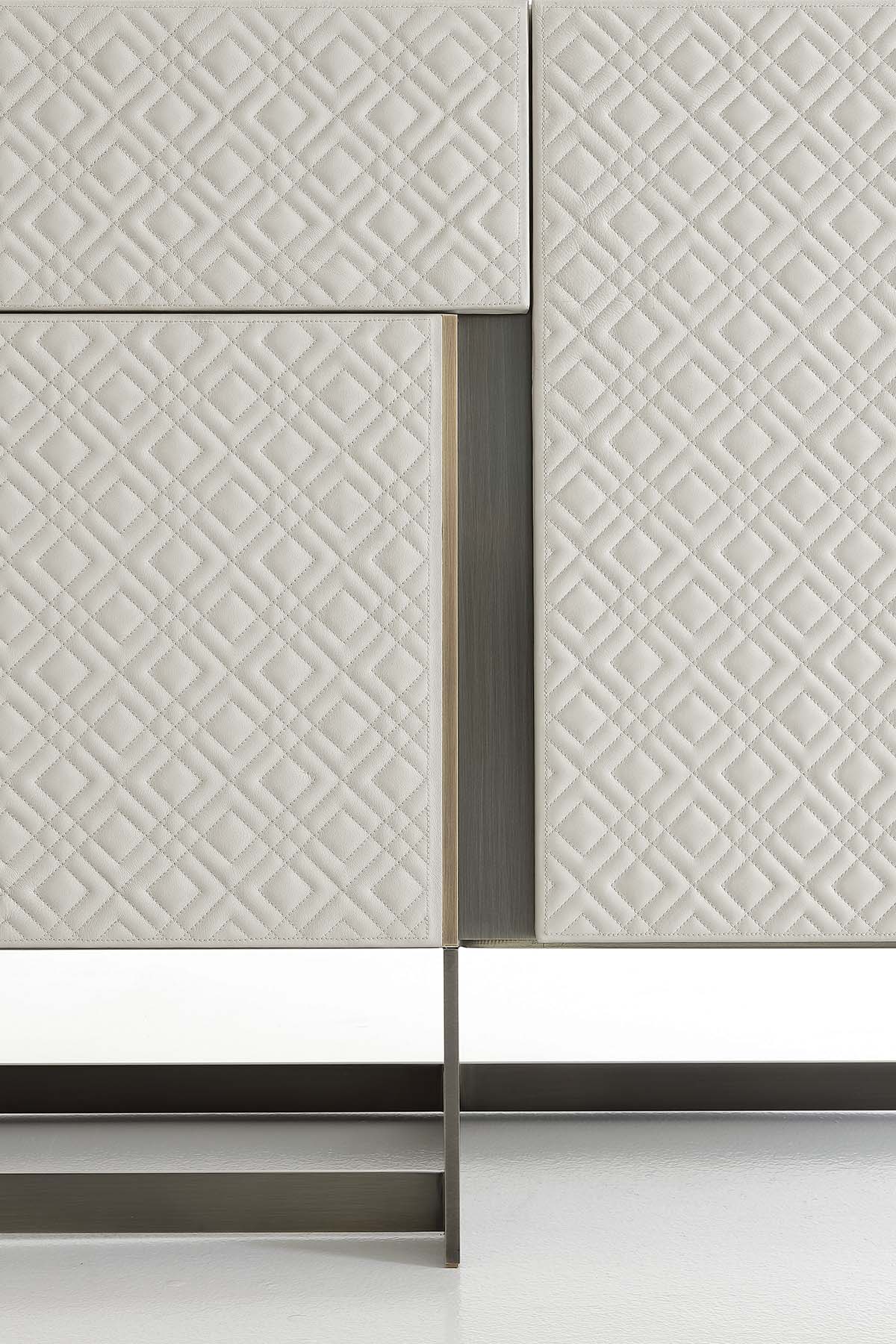 Strutture in ebano o rivestite in pelle ed ante in ebano, rivestite in pelle o decoro per la versione alta della credenza.