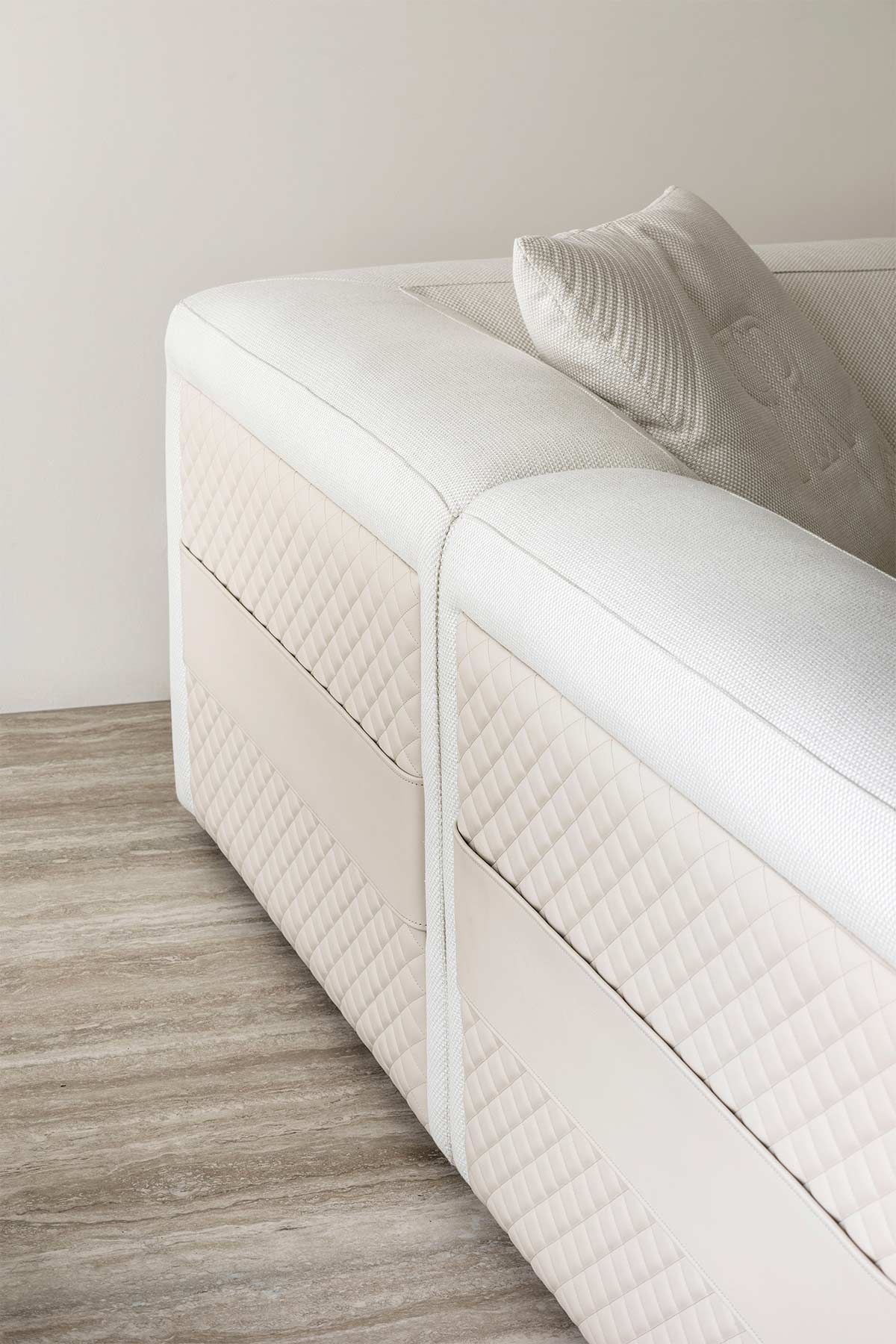 Collezione di imbottiti componibile. Caratterizzata dai pannelli ricamti dei fianchi e dello schienale.