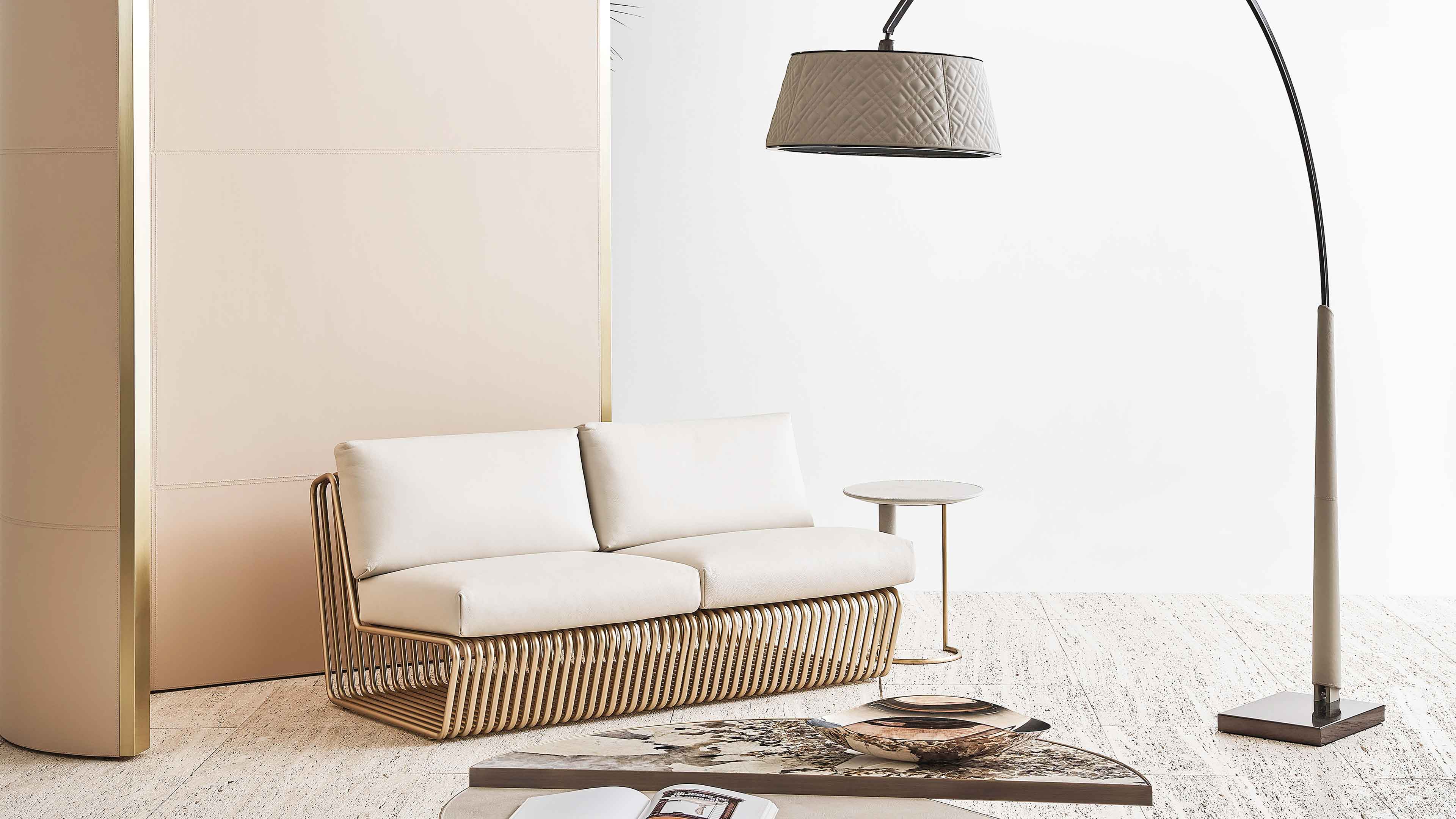 La serie di tubolari accostati e curvati da vita alla seduta, resa confortevole dai cuscini seduta e schienale. Struttura disponibile in oro lucido o cromo nero.