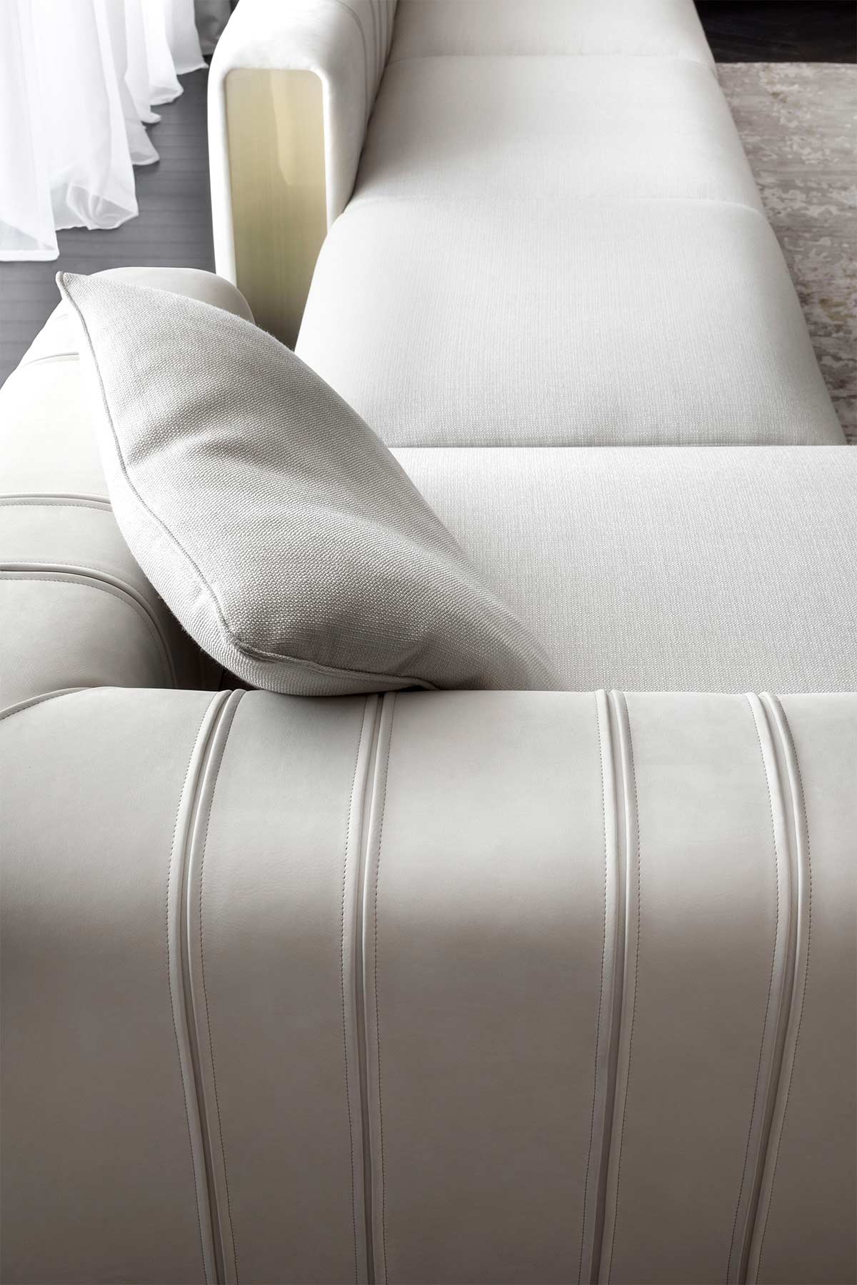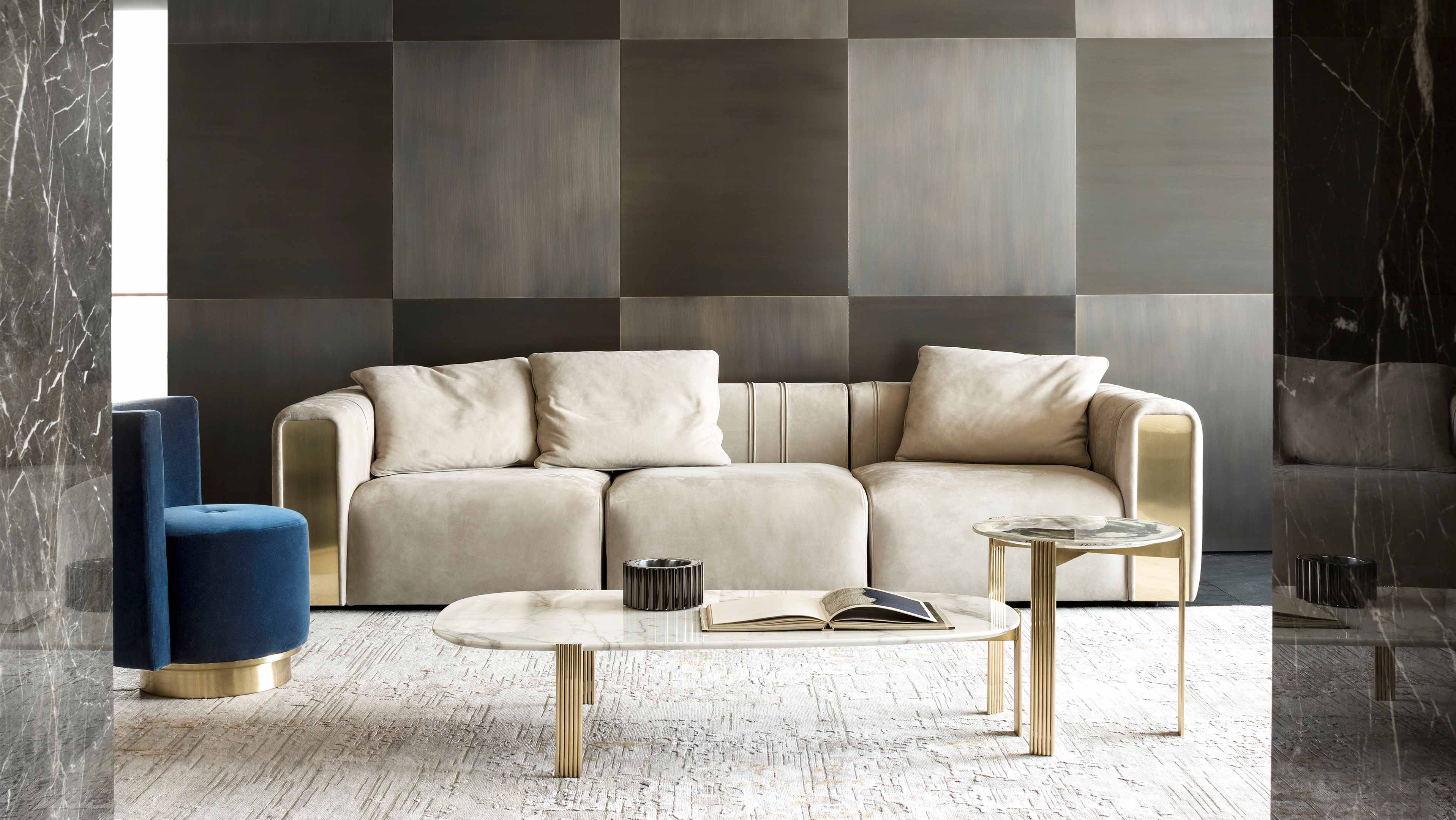 Collezione di imbottiti con dettaglio in ottone spazzolato sul bracciolo e una serie di plisse sullo schienale disposti in modo armonico.