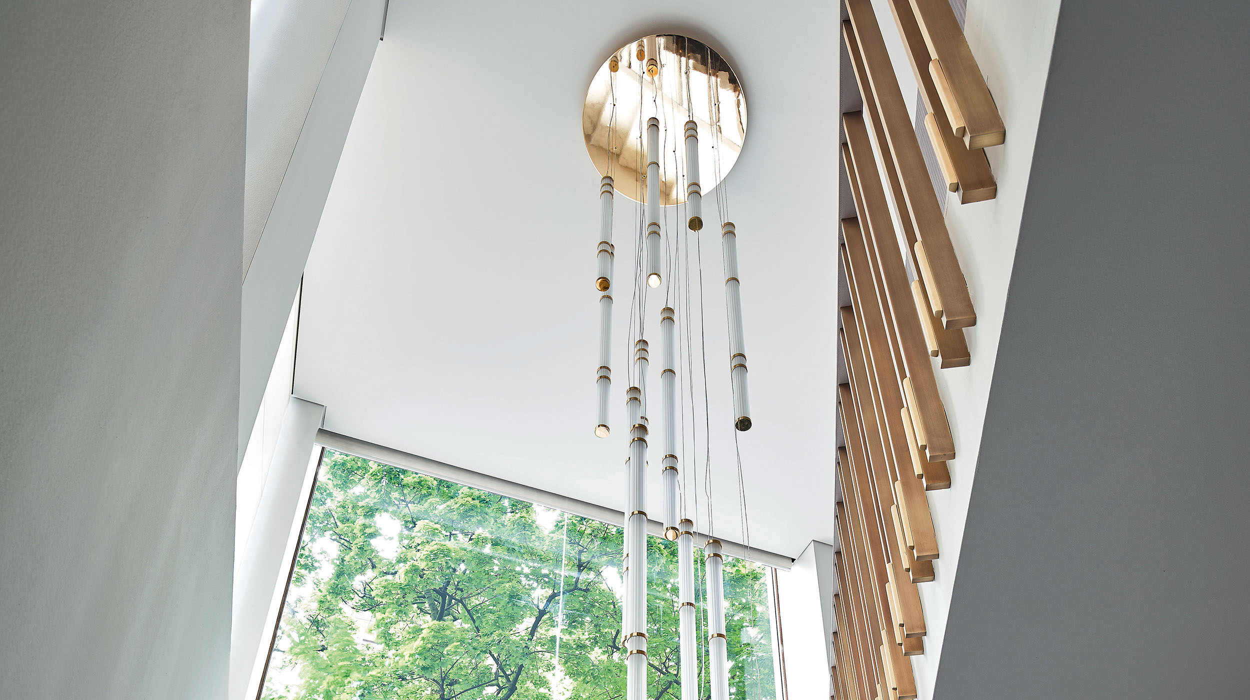 Collezione di lampade vetro satinato con ottone lucido, sospensioni singole o componibili. Forme lineari armoniosamente accostate.