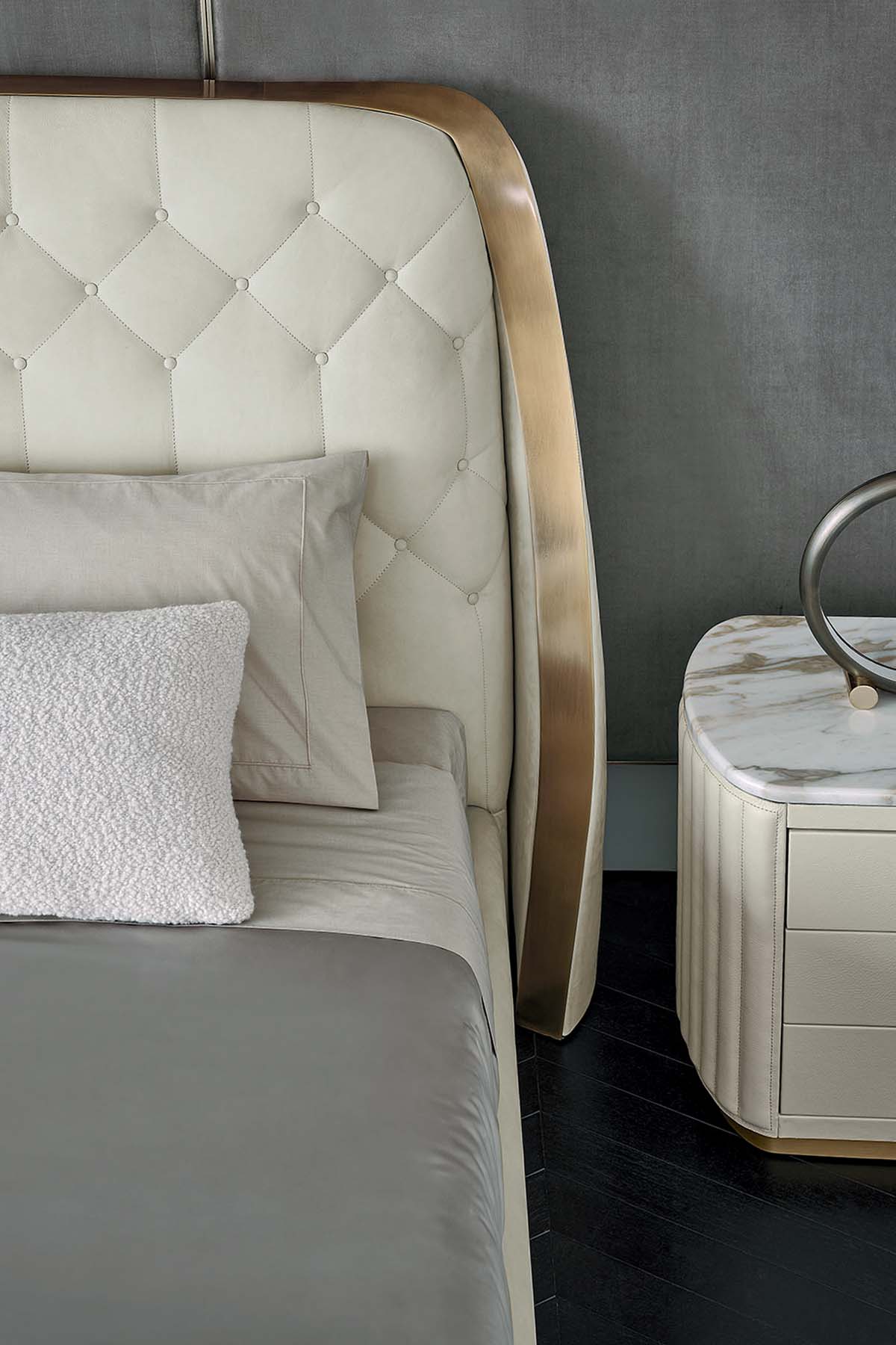 Il letto Damassé reinterpreta l’architettura elegante del modello Dama arricchendola con l’intramontabile lavorazione capitonné. La testiera imbottita, impreziosita da un fitto gioco di bottoni e cuciture, dona profondità e ritmo visivo, trasformando la parete in un fondale scenografico dall’eleganza intramontabile. A incorniciare il volume, la struttura in metallo avvolge la testata come un segno prezioso e luminoso, esaltando il contrasto tra morbidezza e rigore architettonico.