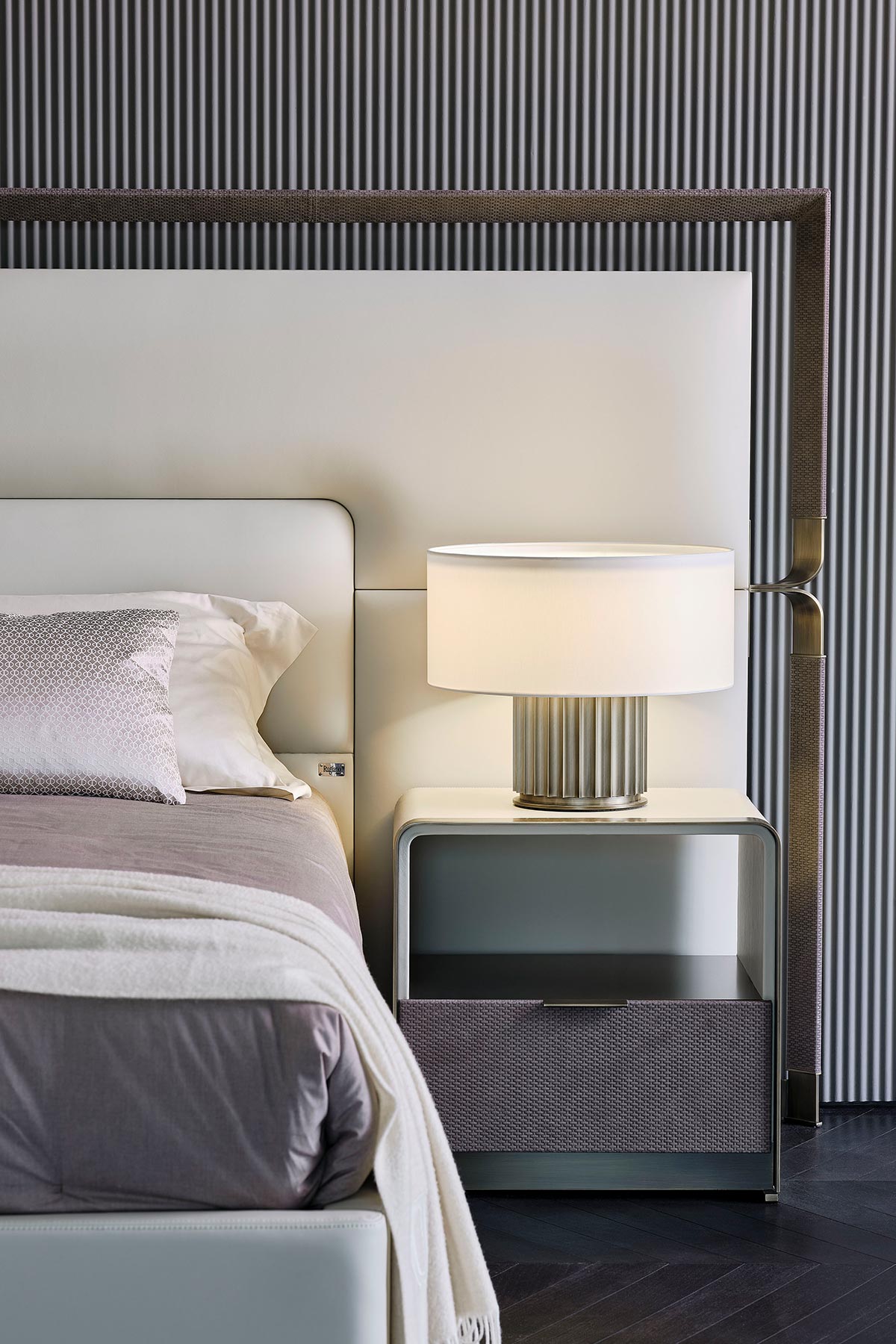 Grace Big eleva l’identità della collezione con proporzioni più imponenti e una forte presenza visiva. La testata imbottita, generosa e declinata in ampiezza maggiore, è incorniciata da un profilo metallico rivestito in pelle liscia o stampata, che ne valorizza il disegno e assicura continuità stilistica.