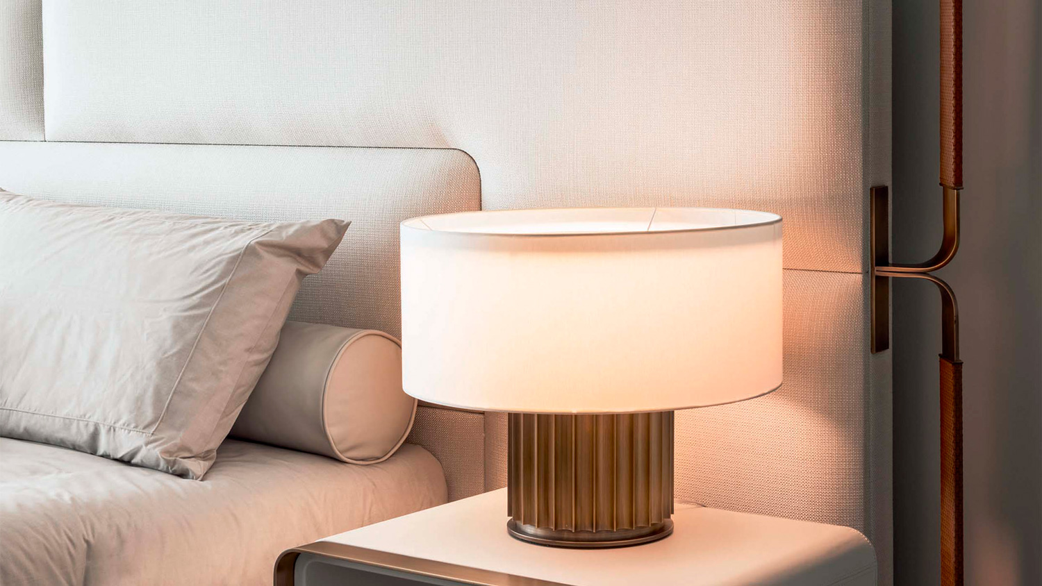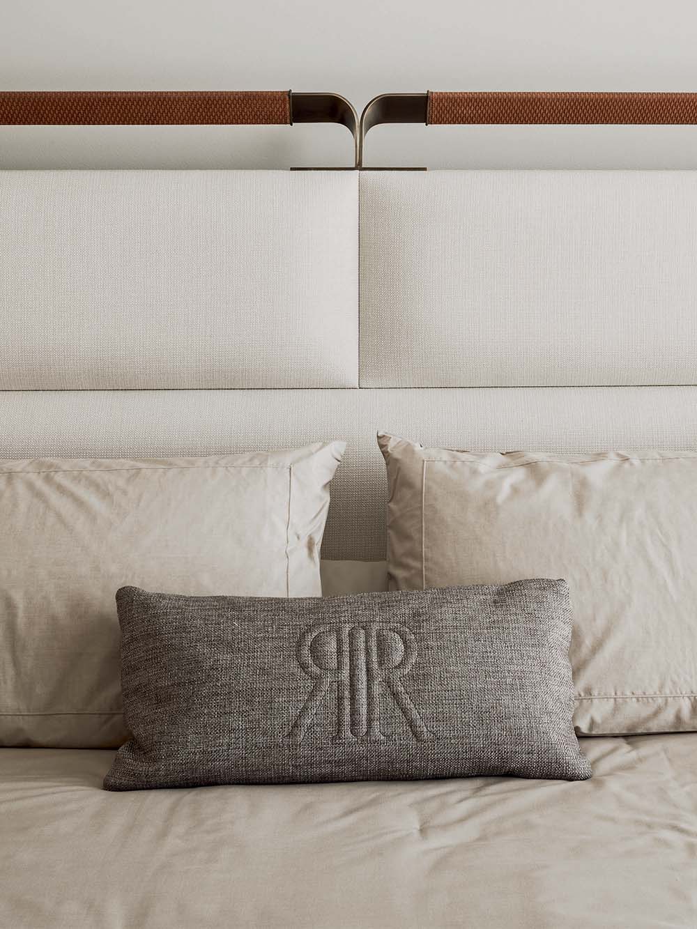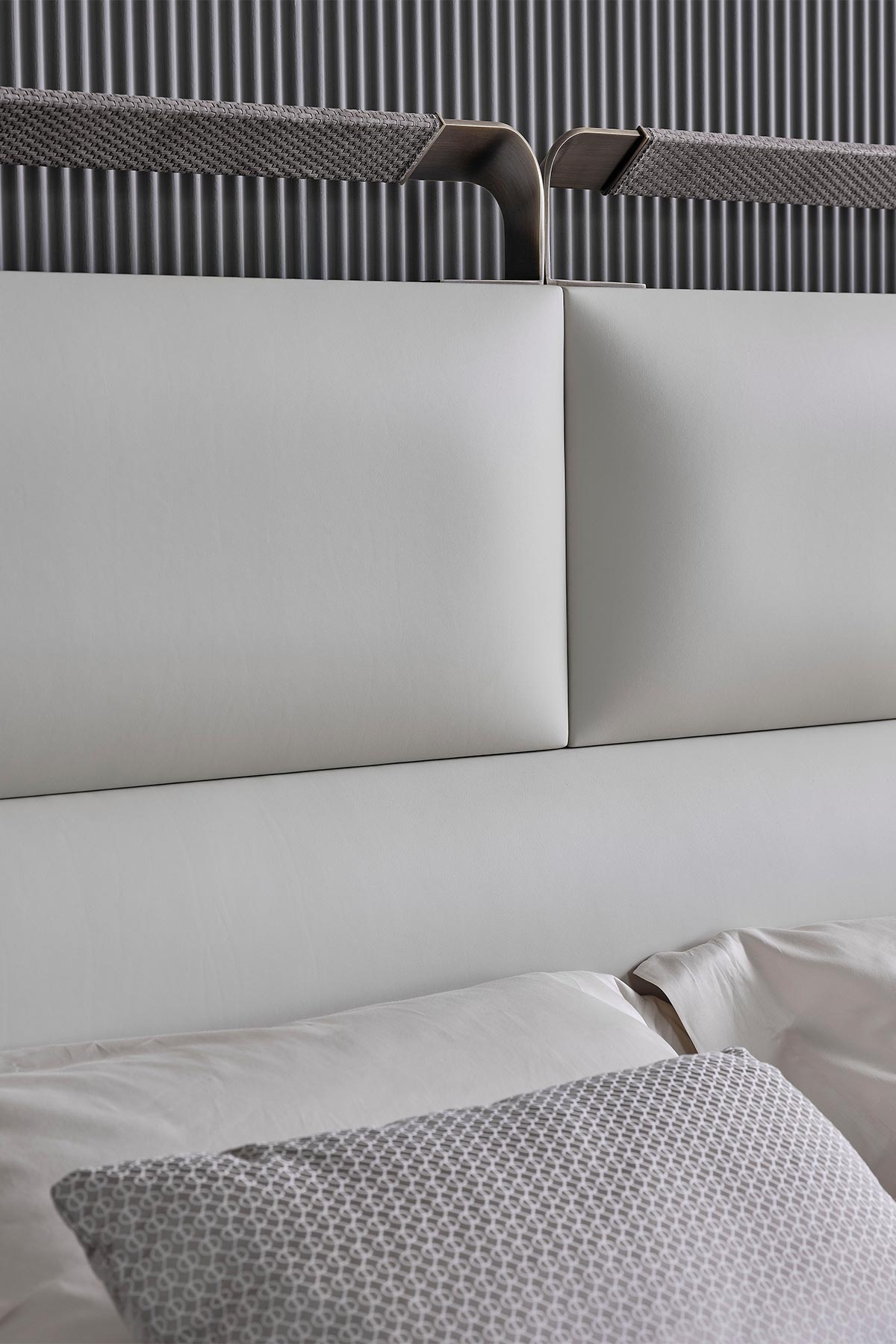 I dettagli in bronzo o ottone, posizionati lungo la cornice e nei punti strategici del letto, introducono accenti luminosi che dialogano con la morbidezza delle superfici. Un contrasto sofisticato tra matericità e luce che arricchisce la struttura senza appesantirla.