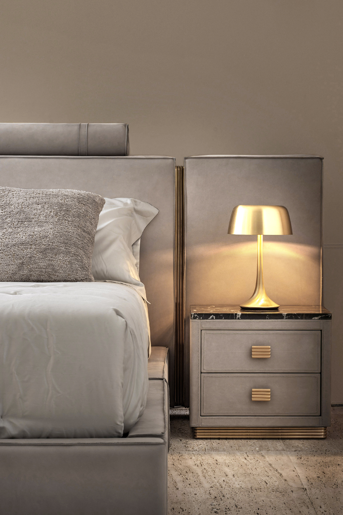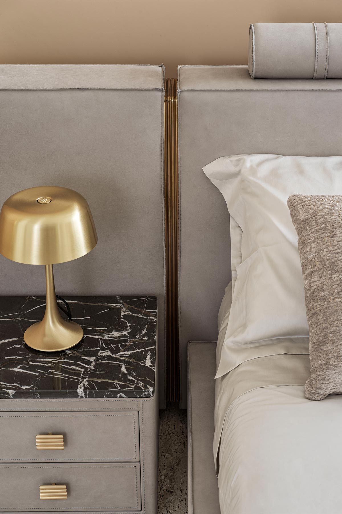 Testata imbottita caratterizzata da dettagli in metallo che intercalati alla pelle creano una piacevole modularità. Rulli decorati e giroletto rivestiti.