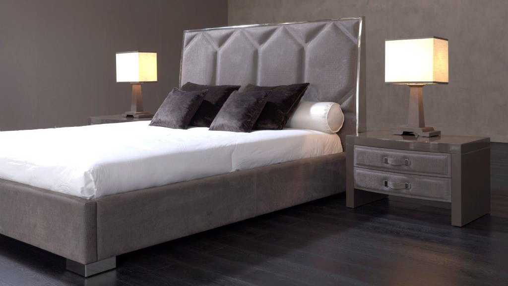 La struttura, essenziale e proporzionata, accoglie il materasso in un basamento compatto e perfettamente rivestito, enfatizzando la purezza del progetto e la qualità delle lavorazioni artigianali. Il contrasto tra finiture opache e riflettenti, unite alla tridimensionalità della testata, dona al letto una personalità unica e raffinata.