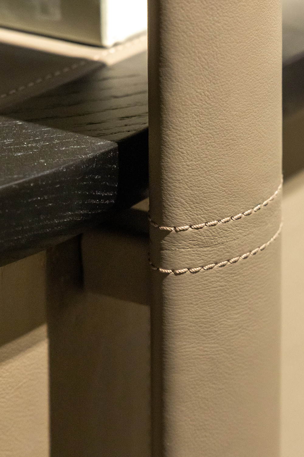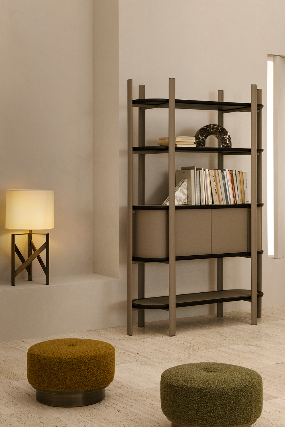 Ogni elemento della collezione è caratterizzato da una struttura rivestita interamente in pelle, impreziosita da cuciture a vista che ne sottolineano la lavorazione artigianale. I montanti esterni, sottili ed eleganti, terminano con dettagli in bronzo che aggiungono un tocco di ricercatezza. La libreria, slanciata e leggera, è dotata di ripiani in legno che alternano spazi aperti a vani chiusi, offrendo soluzioni versatili per l’organizzazione.