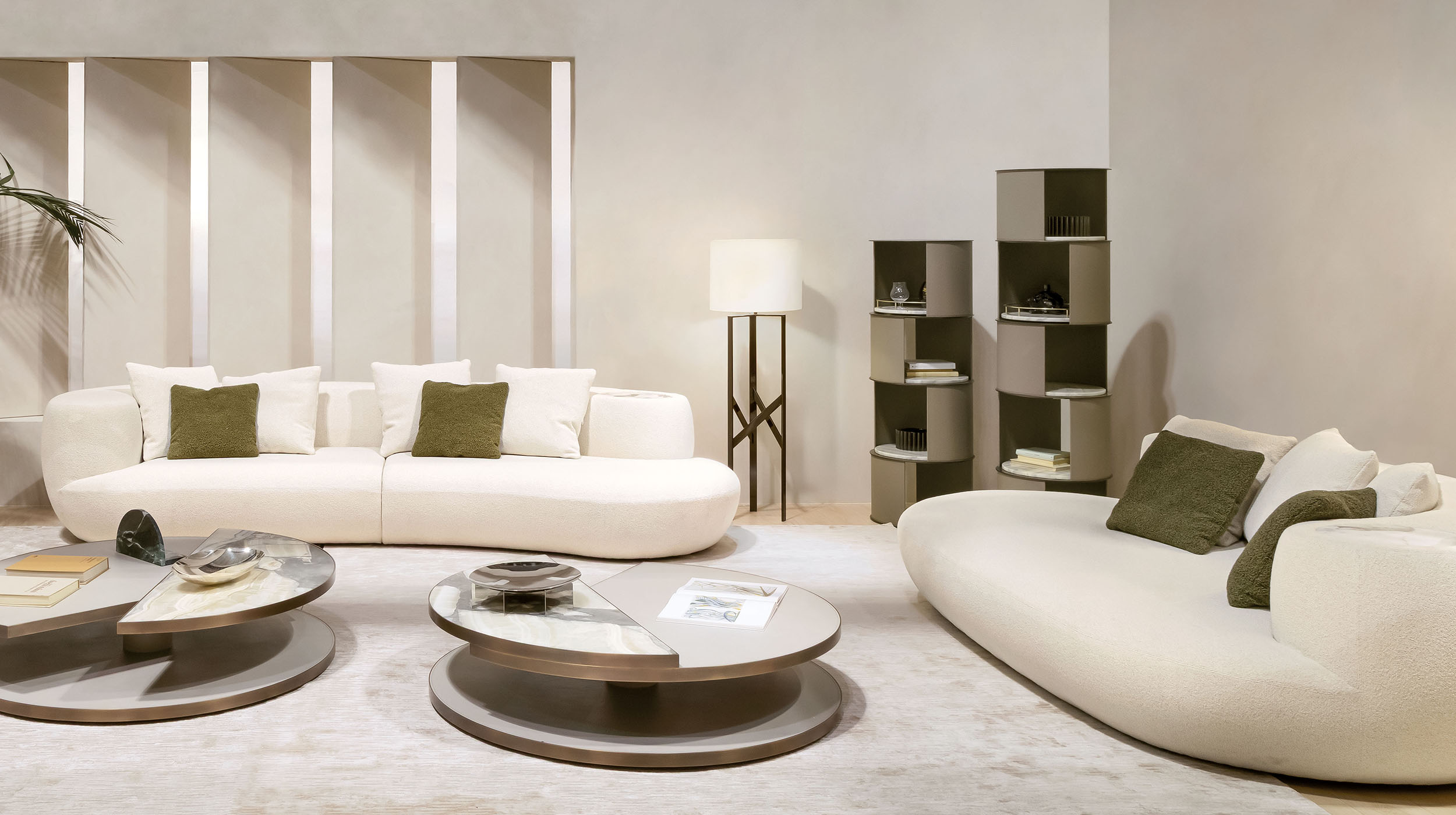 La Floyd si erge come un’elegante colonna d’arredo, combinando spazi aperti e chiusi in un gioco di volumi articolato e sofisticato.
