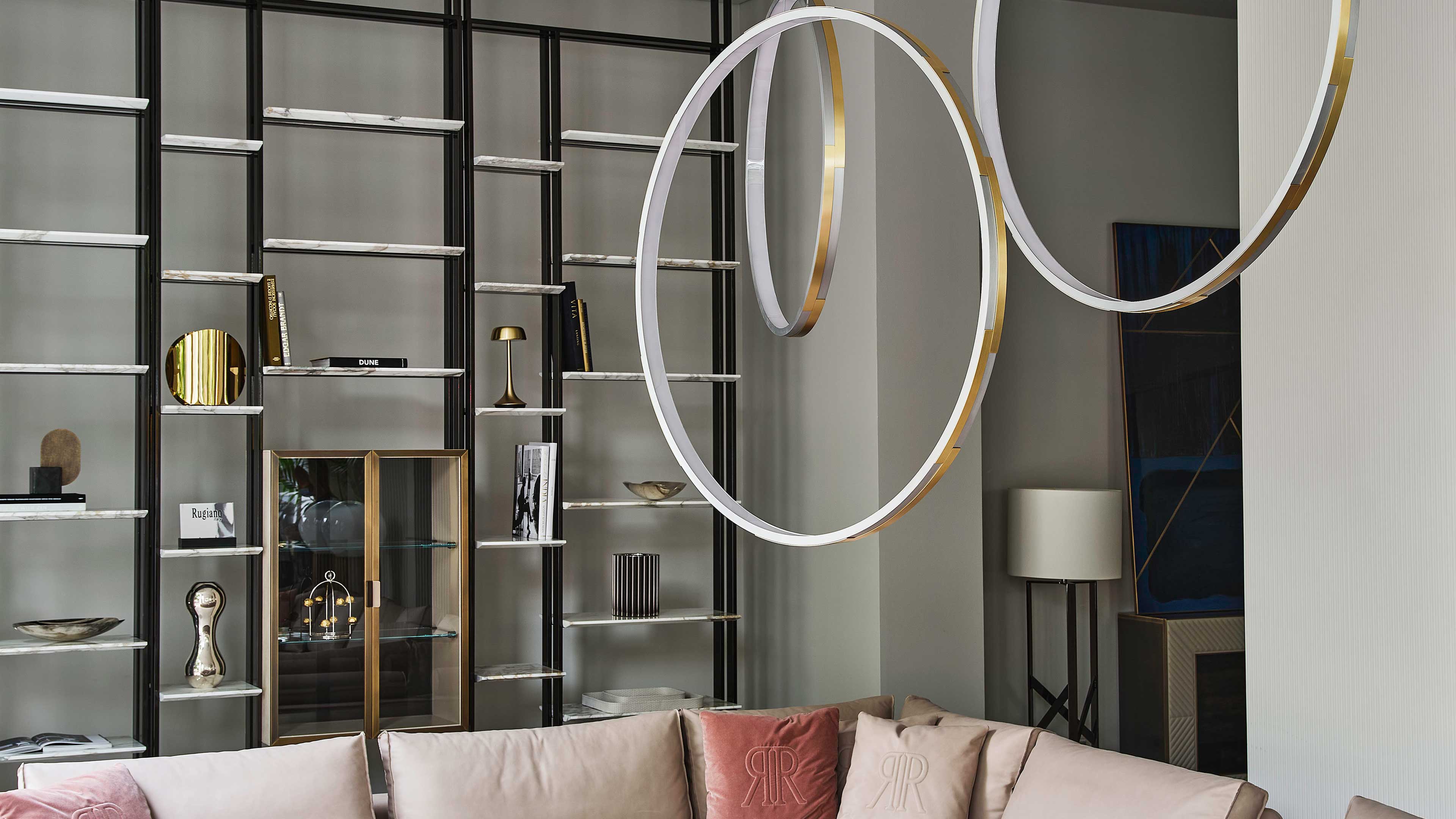 Librerie con montanti in bronzo verniciato o cromo nero, disponibili con quantità diverse di ripiani, rivestiti in pelle o in marmo e con l’aggiunta di box contetenitori anch’essi rivestiti in pelle con ante ricamate e con la possibilità di aver l’apertura